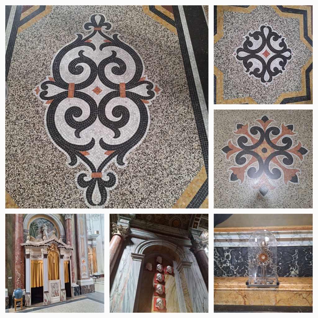 Bij het inleveren van onze audiotour vragen we naar relikwiën. Heeft de basiliek die. Jazeker, bevestigt de gids. Twee zelfs. Bij het altaar staat een monstrans met een splinter van één van de kruisen op Golgotha en bij een levensgroot beeld van Paus Johannes Paulus II een monstrans met daarin een snippertje bebloed textiel. Het is afkomstig van de kleding die hij droeg tijdens de aanslag op zijn leven in 1981. En de gids vertelt ons ook dat er vijf generaties marmerschilders aan de kerk hebben gewerkt. De derde en de vijfde generatie hebben zich in de marmering vereeuwigd en hij laat ons zien waar.