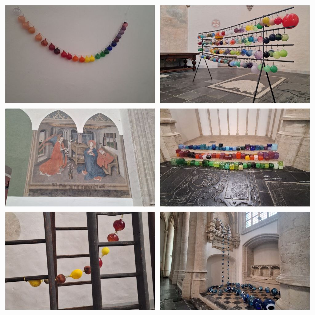 En over oranje gesproken: in de Grote Kerk is een tentoonstelling van objecten waarmee kleur wordt teruggebracht in het nu lichte witte interieur van de kerk. Glazen blokken en bollen, maar ook glazen fruit en felgekleurde houten vormen. En een megarozenkrans van glas.