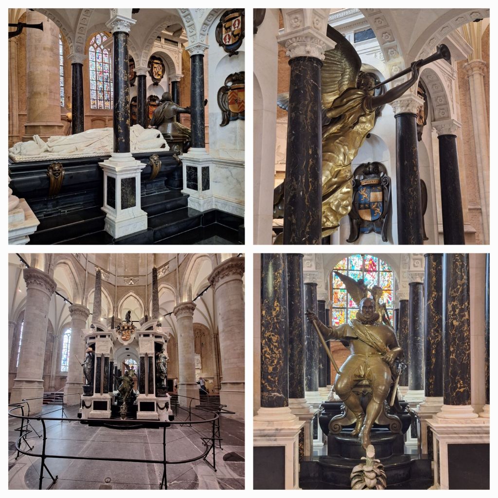 En pontificaal in het koor, op de plek waar ooit het hoofdaltaar heeft gestaan, staat een immens praalgraf. Voor Willem van Oranje. Tweemaal is hij erop afgebeeld. Overleden rustend op zijn baar, bontgevoerde mantel, pantoffels, keppeltje. En middenvoor als veldheer, met veldheerstaf en harnas. Eigenlijk is het een soort altaar voor hem.