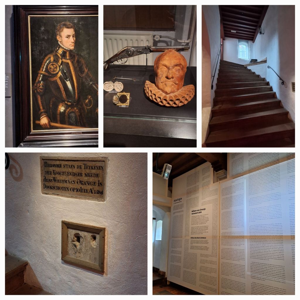 Iets verder op, bij de Oude Kerk, staat het voormalige Agathaklooster, waar Willem na zijn verbanning tussen 1572 en 1584 vaak verbleef. Er is een kleine tentoonstelling over hem en zijn directe nakomelingen. En natuurlijk is daar de trap met de zo beroemde kogelgaten. Hier op deze trap is het gebeurd, een politieke moordaanslag en de eerste in de wereldgeschiedenis met een handvuurwapen.