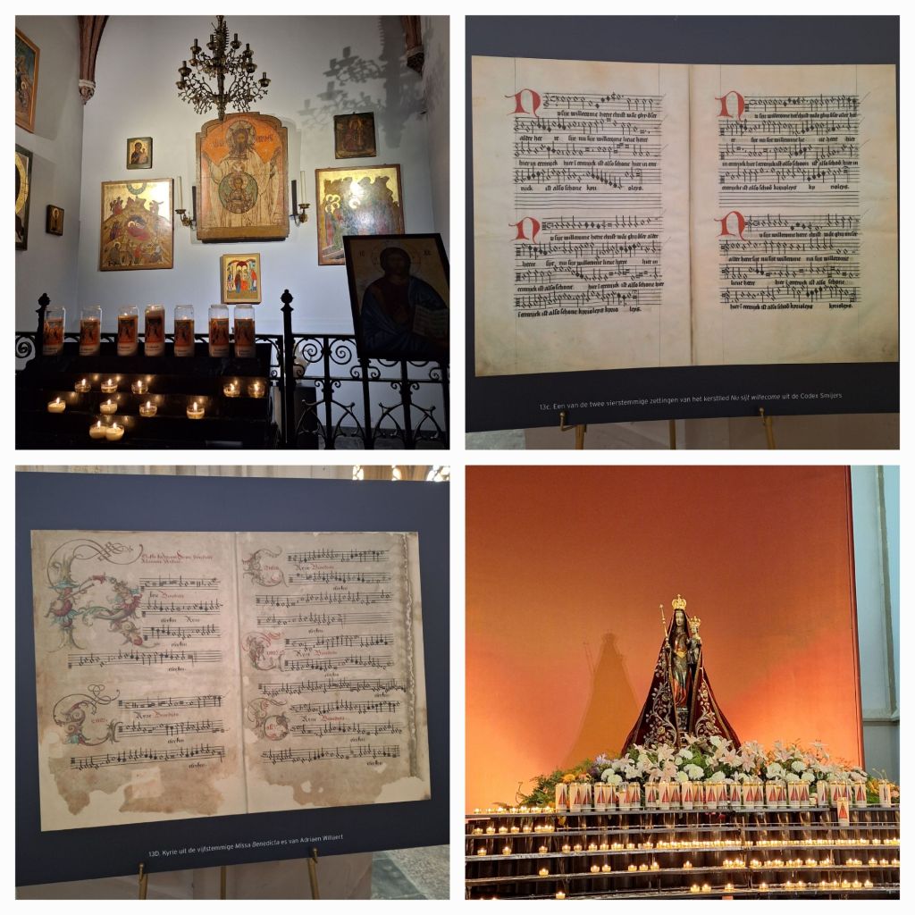 Het loopt tegen 12 uur inmiddels en de koster is druk bezig alles voor de viering in orde te maken. Spontaan besluit ik de viering mee te maken. Het koororgel speelt en het jongerenkoor verzorgt de zang. Zoals altijd in een Rooms-katholieke viering kom ik onder de indruk van de rituelen. De wierook die opstijgt, de aanbidding, de zang. Via het boekje kan ik de teksten volgen en meespreken en zingen. Als de viering voorbij is, vervolg ik mijn TourCast die eindigt in de Maria-kapel, met het 13e eeuwse beeldje van Maria met Jezus, beiden getooid met mooie mantels en gouden kroontjes.