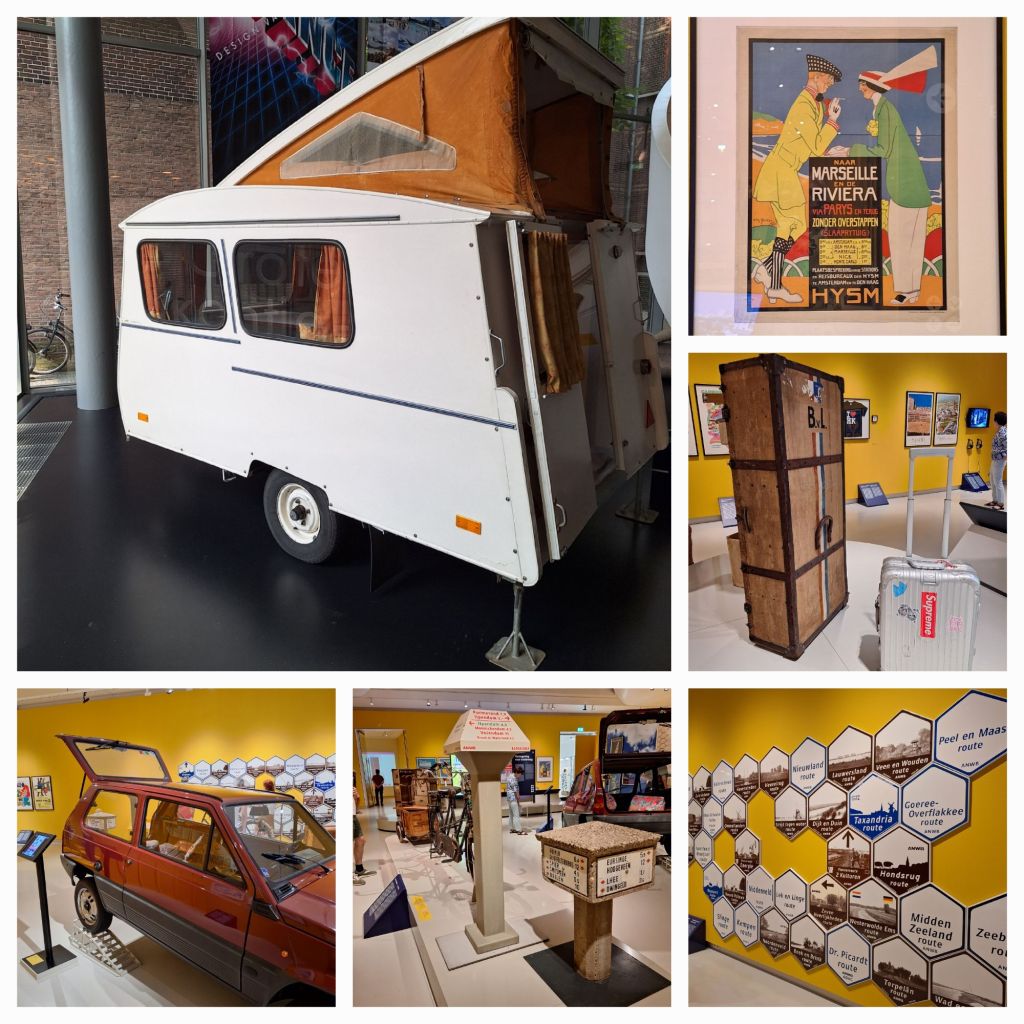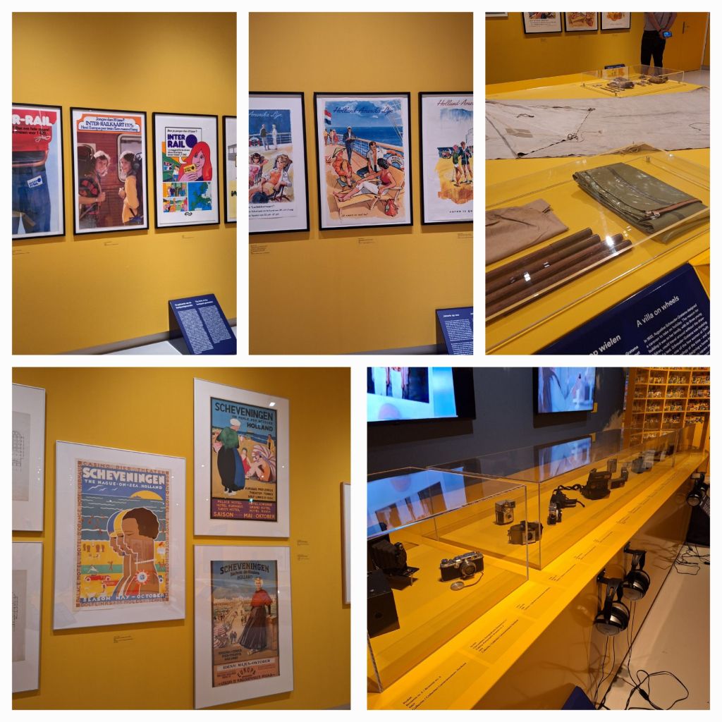 Met vakantieaffiches, landkaarten en boeken, stereofoto’s, souvenirs en ansichtkaarten, ski- en badkleding, een Fiat Panda, een tent met toebehoren, camera’s in alle soorten en maten, een hut- en een rolkoffer, een tandem met aanhanger, de typische zeshoekige ANWB-routebordjes en de paddestoelwegwijzers wordt een beeld gegeven van vakantie houden in de laatste 150 jaar.