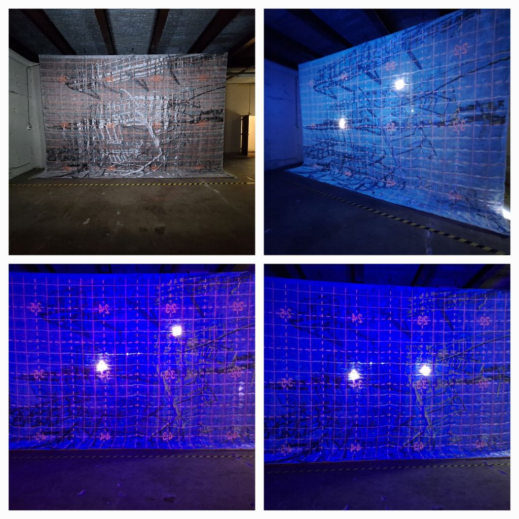En bij de start hangt een geweven kleed, doorzichtig jaquard met lichtgevende draden er in. Het vormt één geheel met een lichtspel van drie minuten, waardoor je iets ziet van een grid en vliegbewegingen.