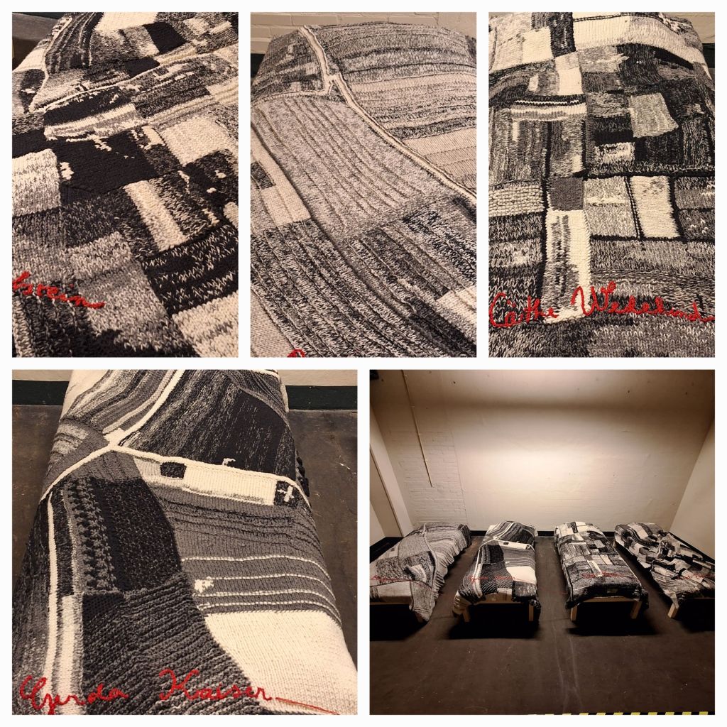 In een ruimte is een soort slaapzaaltje ingericht, als of de Blitzmädel elk moment binnen kunnen komen. Op de bedden liggen spreien, handgebreid, met voorstellingen van luchtfoto’s in zwart-wit, met vrouwennamen in rood geborduurd.