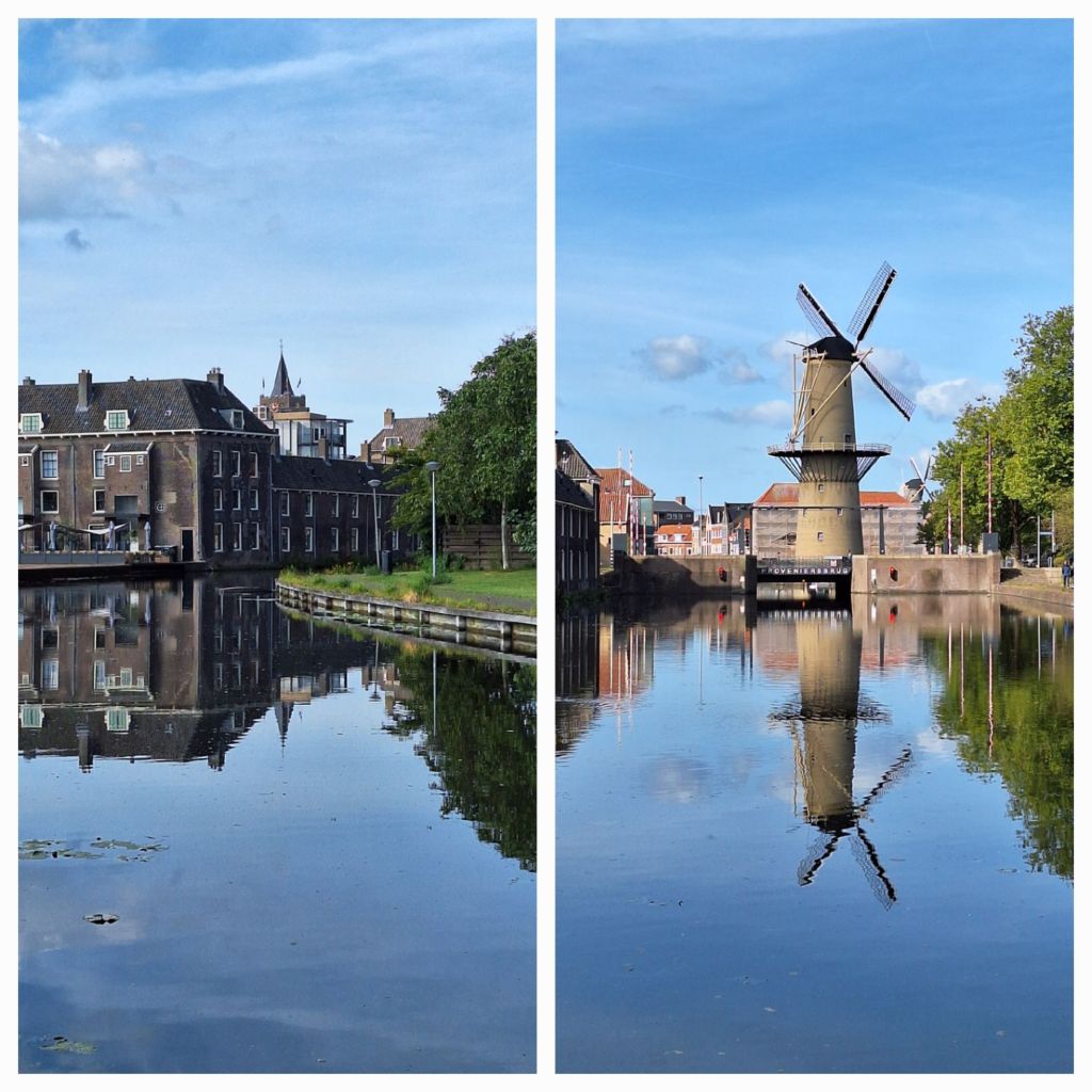 Het is schitterend weer, wel fris, als ik het station uitloop en meteen aan de oever van de Schiedamse Schie sta. Molen de Kameel schittert tegen de blauwe lucht én in het water.