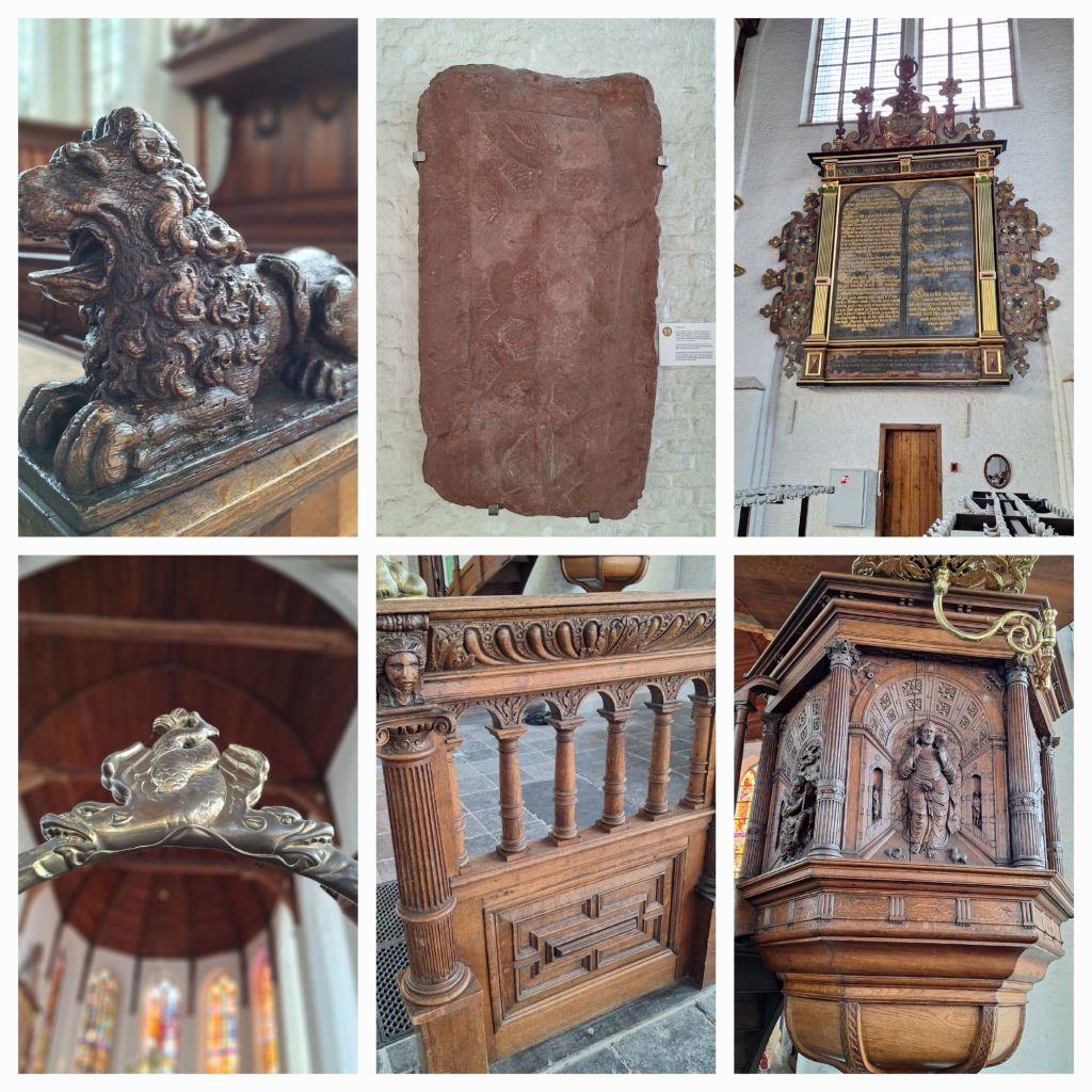 De huidige kerk is licht en wit, als gevolg van de beeldenstorm, maar heeft nog wat belangrijke stukken van voor de Reformatie in huis.