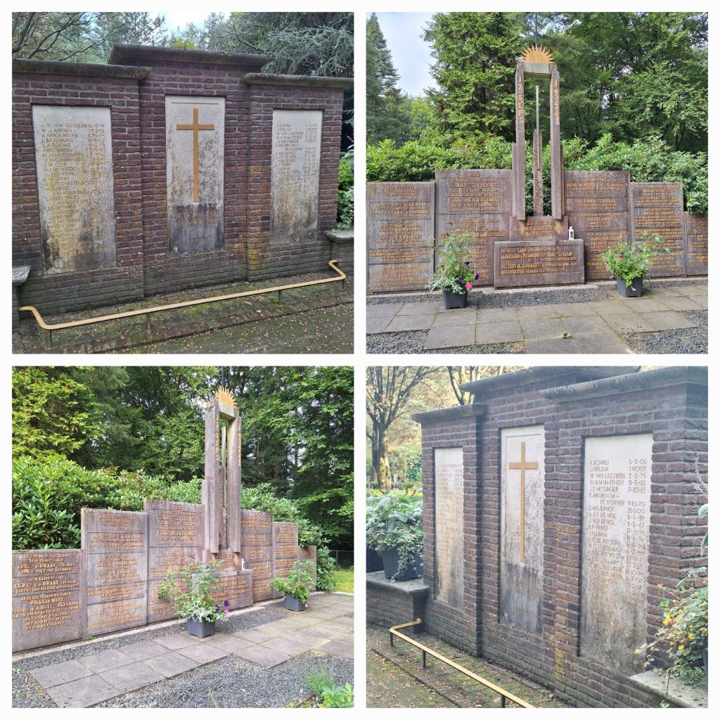 Bij de begraafplaats van Wolfheze staan we stil bij de monumenten. Paul vertelt dat de overledenen verzameld werden en snel, zonder plechtigheid, zelfs zonder kist, begraven zijn. Het was nl. constant oorlog. Gevechten en bombardementen vonden plaats, en snel daarna werd het hele gebied geëvacueerd. Na de oorlog is er niet herbegraven maar zijn er monumenten geplaatst bij de graven. De namen van Pauls oom en opa staan op de rand van het massagraf.