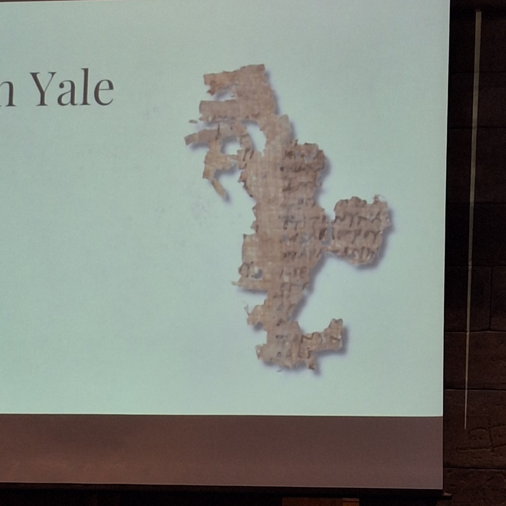 Er zijn minder mensen dan vrijdag en donderdag, maar toch is de zaal goed gevuld. Ik zoek een mooie plek uit en bekijk de afbeelding op het scherm: een zwart papyrus fragment waarop enkele tekens te ontwaren zijn.