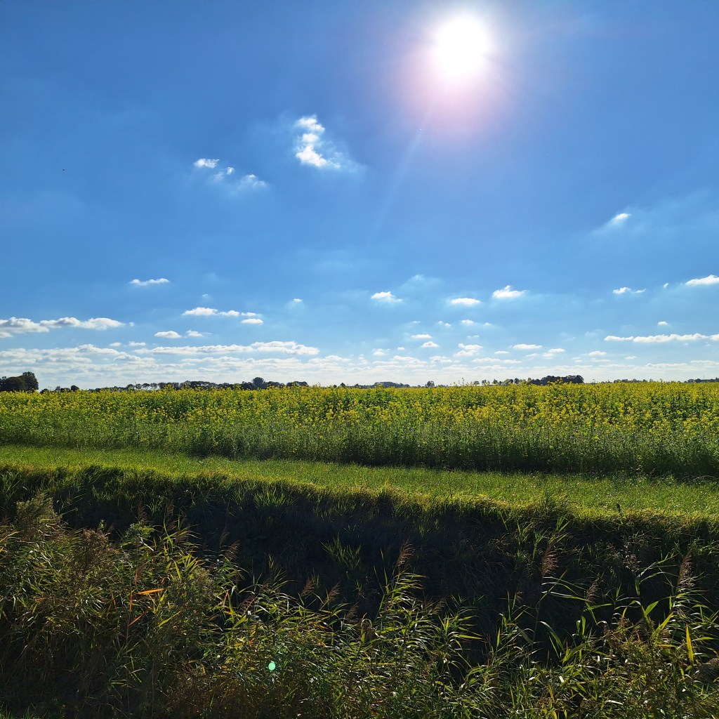 Ik laat Bedum achter me. Het is zo rustig hier. Soms een auto, wat fietsers, wandelaars en hardlopers en van tijd tot tijd ronkt het dieseltje Groningen-Delfzijl of vice versa langs. En een intens blauwe hemelkoepel over alles heen. Ik zei toch paradijs?