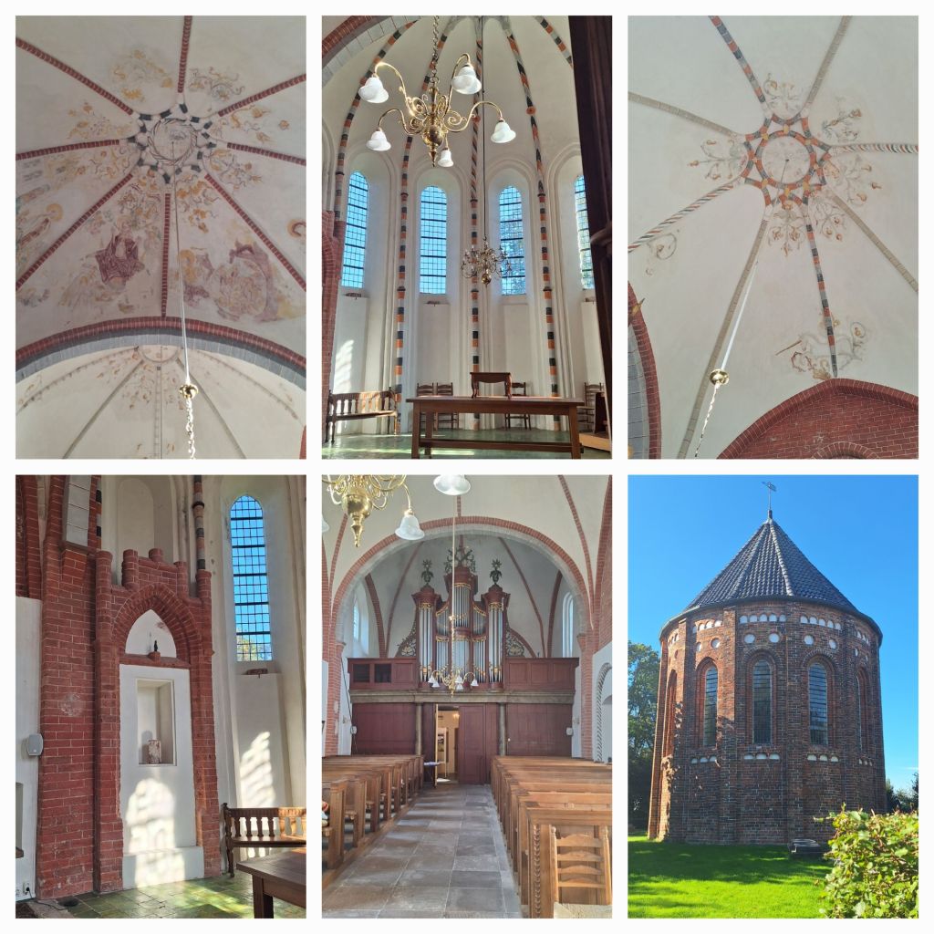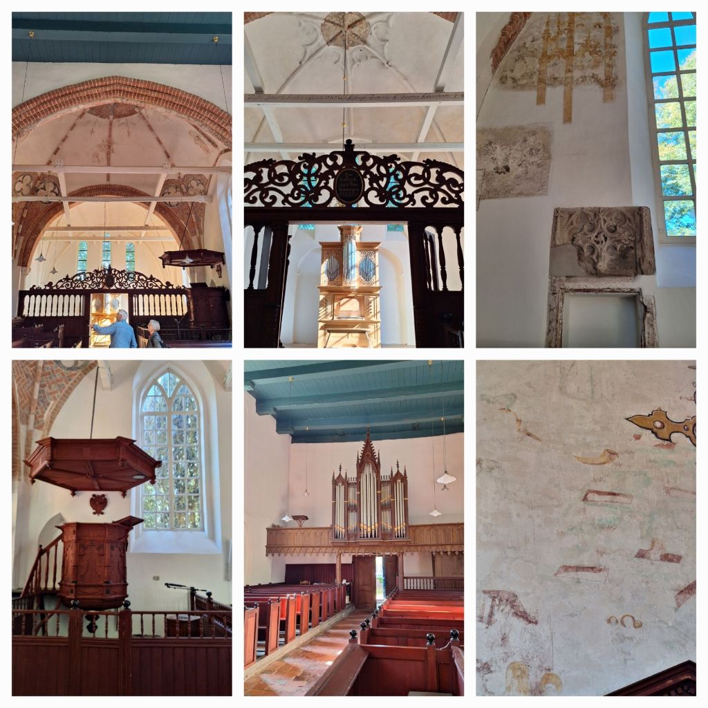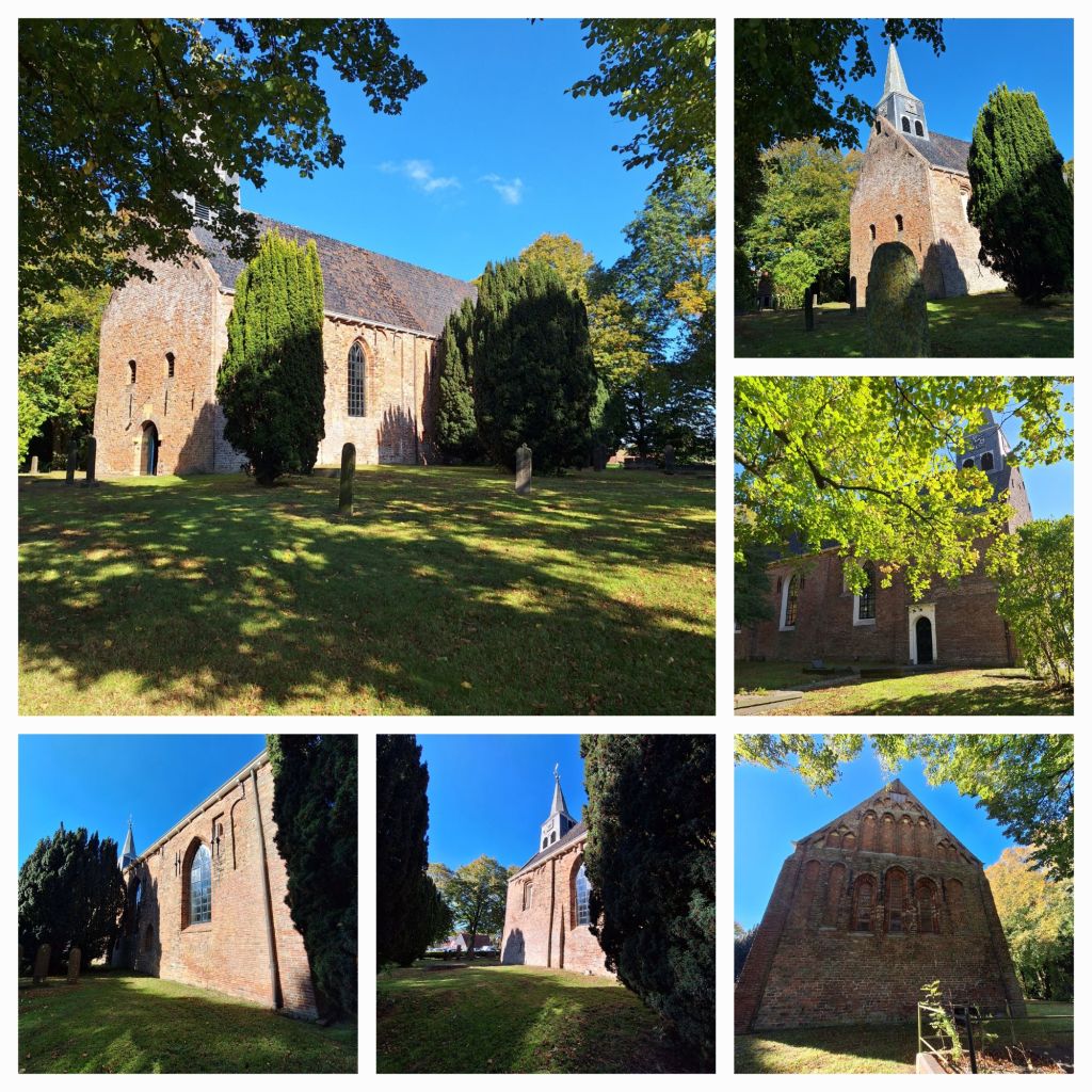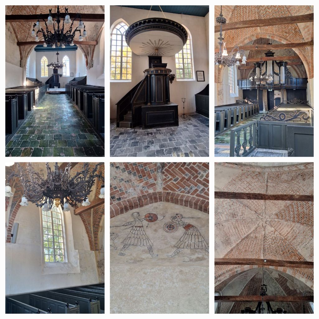 De kerk staat wat hoger en op een stoel bij de deur staat een bordje ‘Open’ en zo sta ik even later in deze bijzondere kerk. Medio vorige eeuw nog schapenstal en opslag, nu prachtig gerestaureerd. Het is een 13e eeuwse Mariakerk, die ooit los stond van de toren maar in de 16e eeuw zijn toren en kerk verbonden. Het mooie kerkje heeft groene estrikken op de vloer, bakstenen gewelven en een heel bijzondere schildering van twee Friese kampvechters. 13e of 14e eeuw. En een prachtig orgelfront. Loos, dat dan wel.
