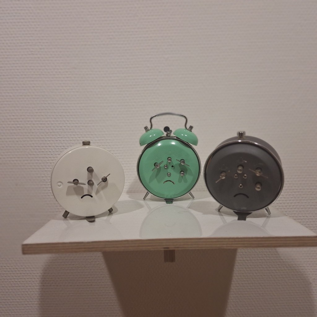Kunst kan je ongemakkelijk laten voelen, zoals vooral in de laatste zalen, maar heeft ook het vermogen je te laten lachen. In het eerstje nisje staat een beeldje van een gapende man en ik begon op slag te gapen. Doe het zelfs nu weer, nu ik dit tik. En in het laatste nisje van de tentoonstelling staan ‘sad machines’. Drie mechanische wekkers met de achterkant naar me toe. Dubbelzinnig, die achterkanten zijn inderdaad net sippe gezichtjes, maar zo’n wekker maakt je ook wakker uit de zoete slaap, terwijl je dat misschien niet wilt.