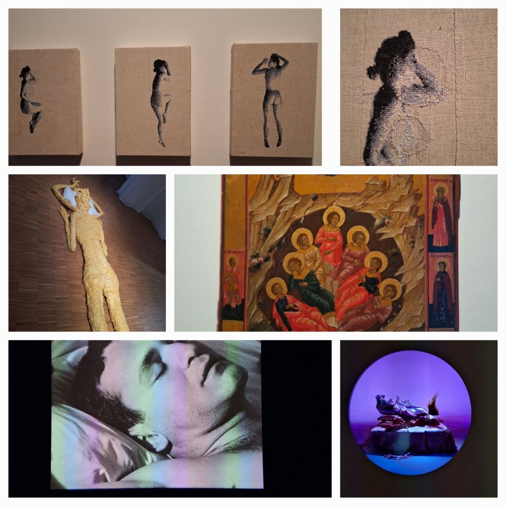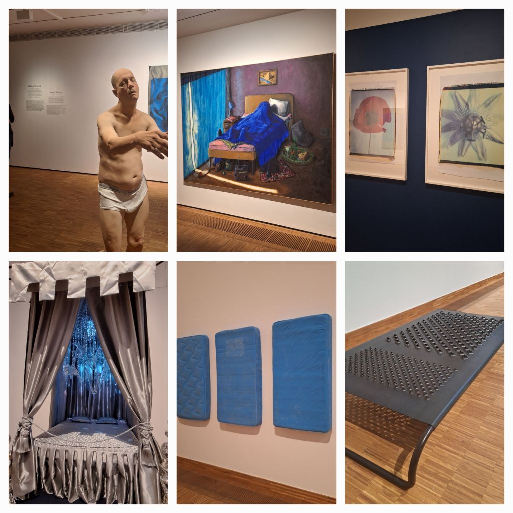 Maar er is van alles te ontdekken en zelfs te doen. Zoals bedden waarop je mag liggen, een huisje waar je via een trapje in kunt kijken (om er vervolgens achter te komen dat je a.h.w. in een bed ligt), een game (niet gedaan want niet mijn ding). En verder ook borduurwerk, een metalen slaapzak, een betonnen man met zijn matras op zijn rug, een schilderij van vluchtelingen.