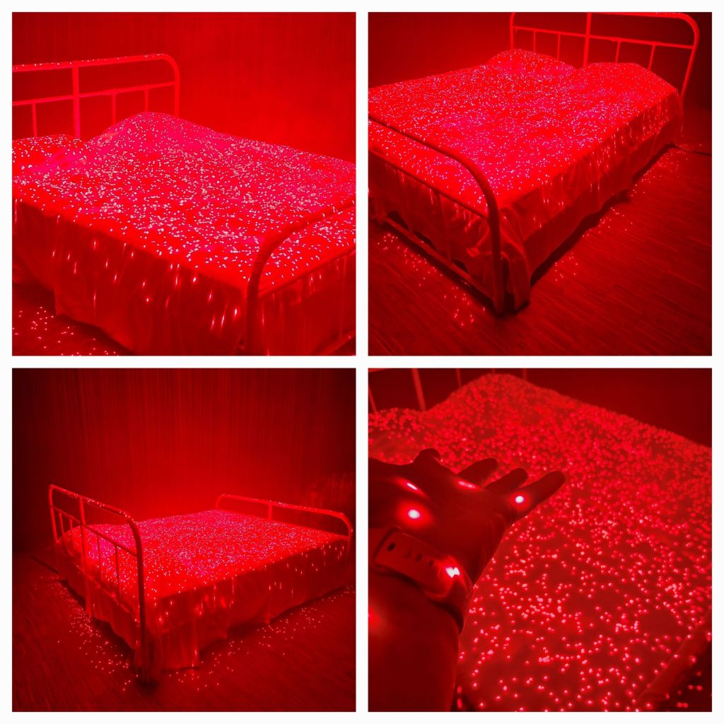 Bij dit stuk moet je door een gangetje van blauwe gordijnen en kom je in een sprookjesachtige slaapkamer. Een opgemaakt bed, beschenen met honderden laserlichtjes met zo nu en dan de mist van een rookmachine. Feeëriek vind ik het.