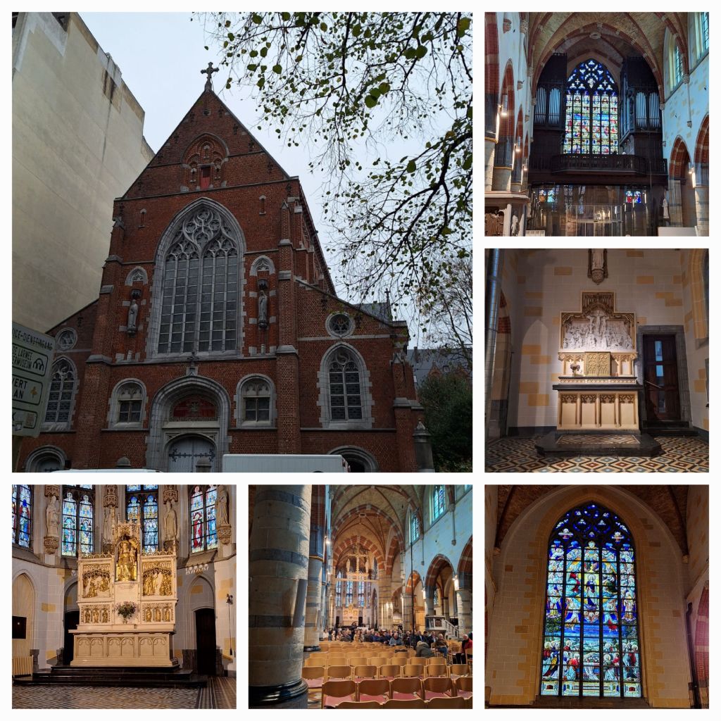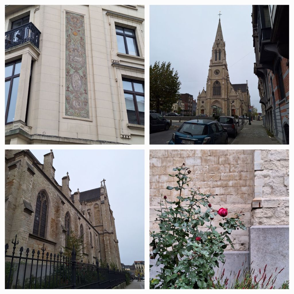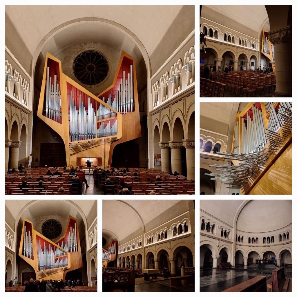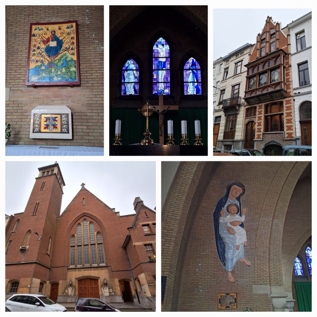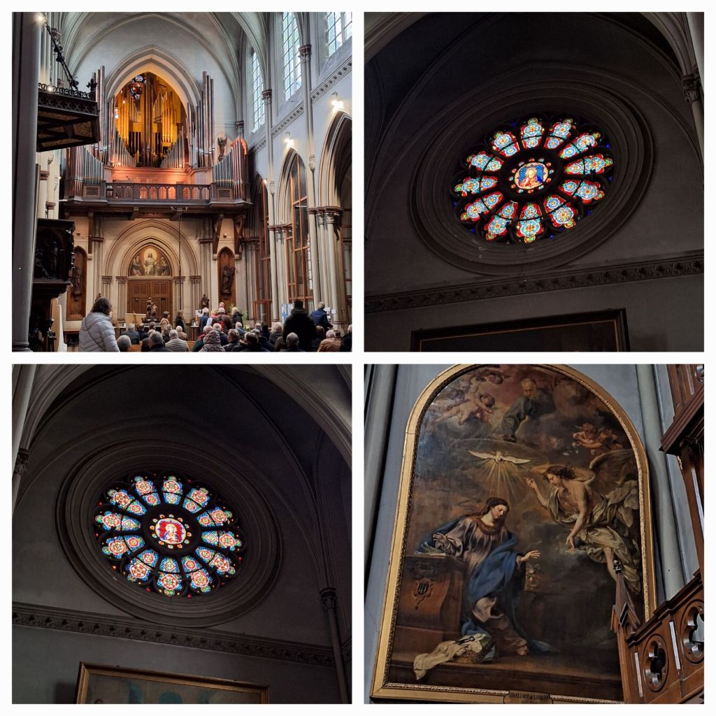 Na een gezellige maaltijd stappen we weer op de bus. Inmiddels is de grijze mistige dag een donkere avond met miezer geworden en zo stappen we de église du Chant d’Oiseaux binnen. Ofwel église Notre-Dame-des-Grâces ofwel Onze-Lieve-Vrouwe der Genadekerk in Vogelzang, een wijk van Sint-Pieters-Woluwe.