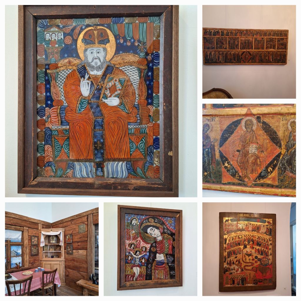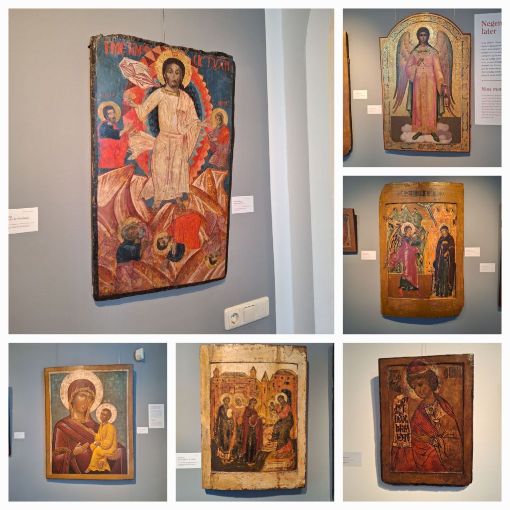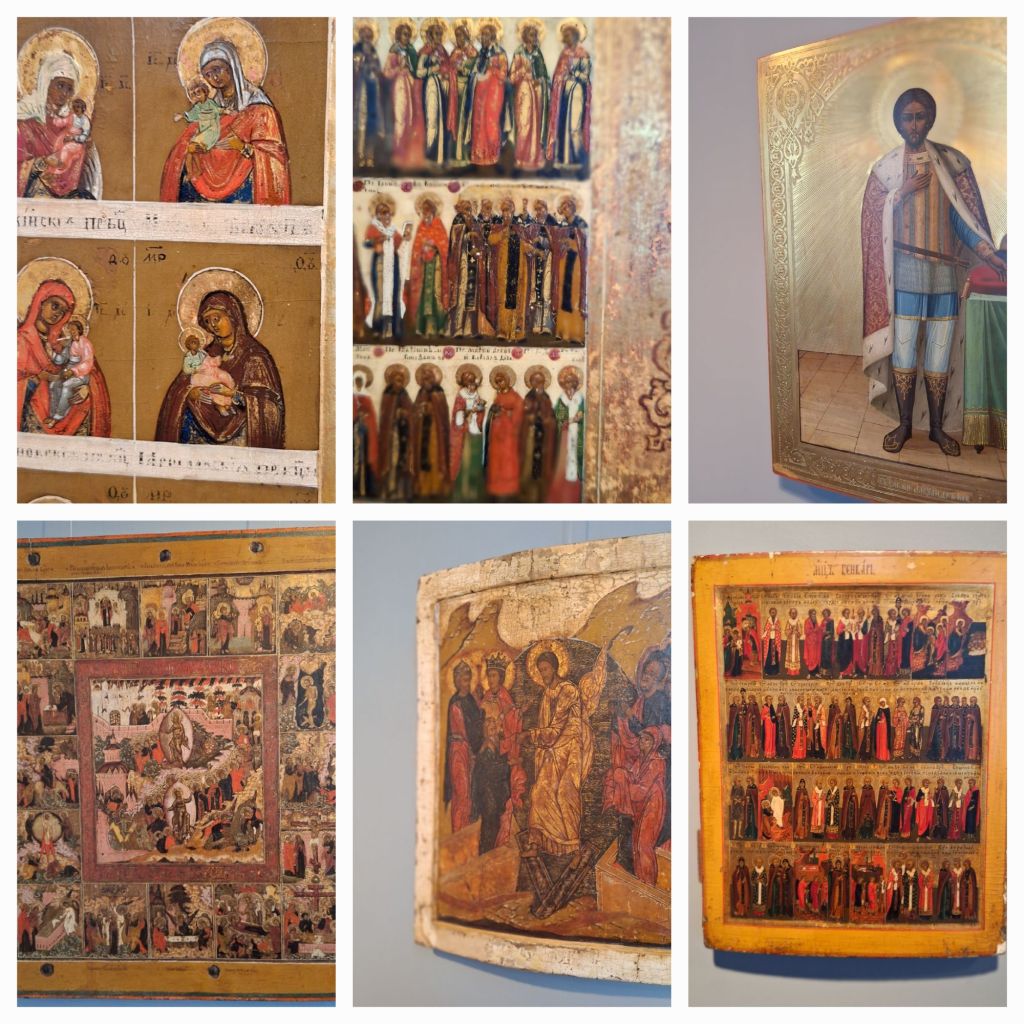 In het museum hangen een paar grote kalenderikonen, die een soort liturgische jaarkalender zijn. De hoeveelheid tijd die daar in is gaan zitten, is onvoorstelbaar. Honderden piepkleine figuurtjes, met ieder hun eigen attribuut of kenmerk.