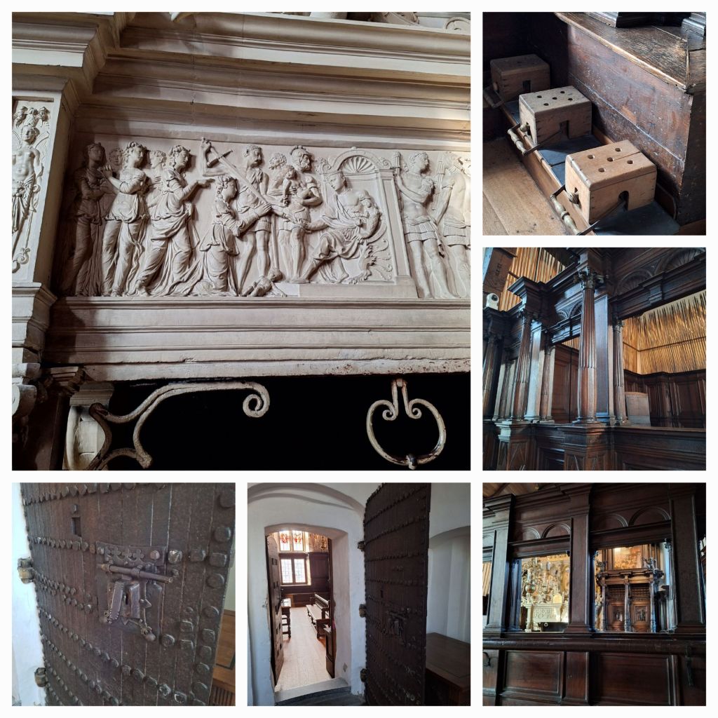 Op de eerste verdieping is de Schepenzaal, 16e eeuws, met een rijkversierde zandstenen schouw, een schepengestoelte, banken langs de zijden en stoofjes bij de schouw.