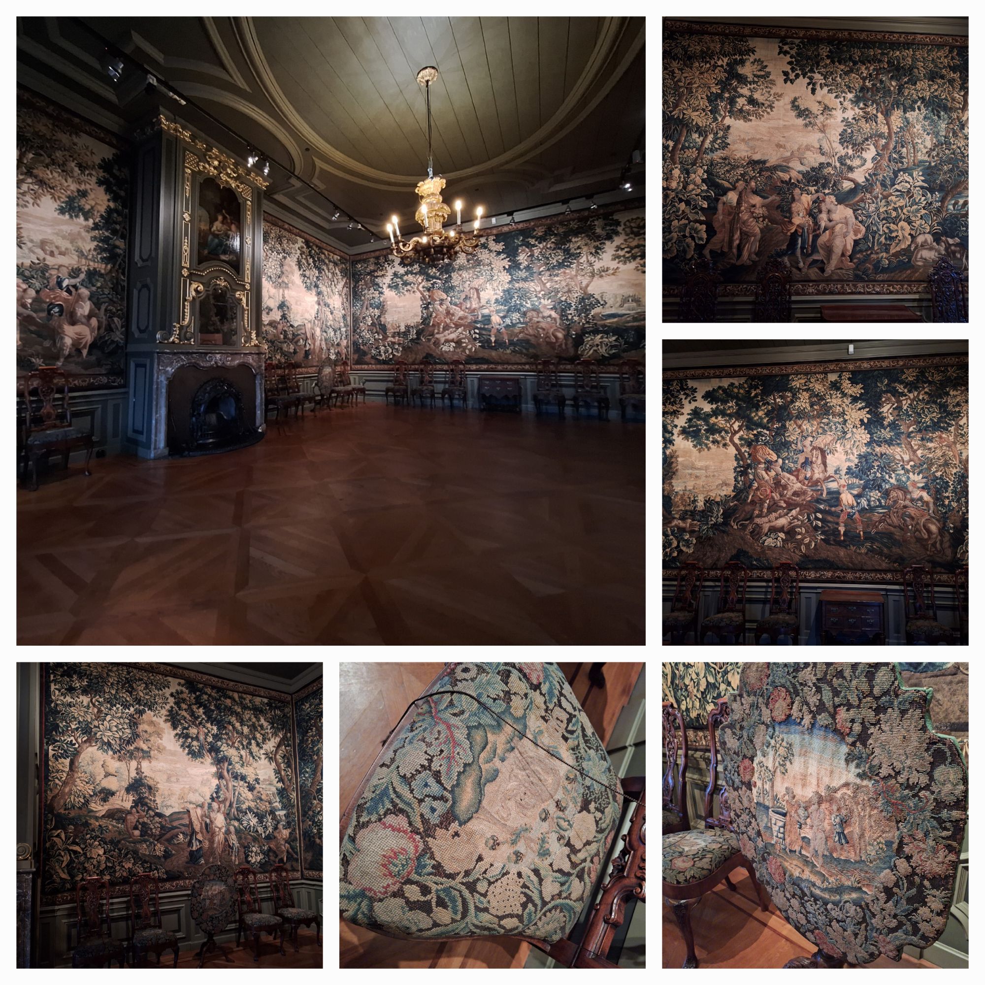 De stoelen zijn niet meer origineel, maar in wel in dezelfde stijl, laat Lodewijk XIV. Als ik iets dichterbij kom, zie ik dat ze allemaal geborduurd zijn. Zelfs het klaptafeltje is geborduurd.