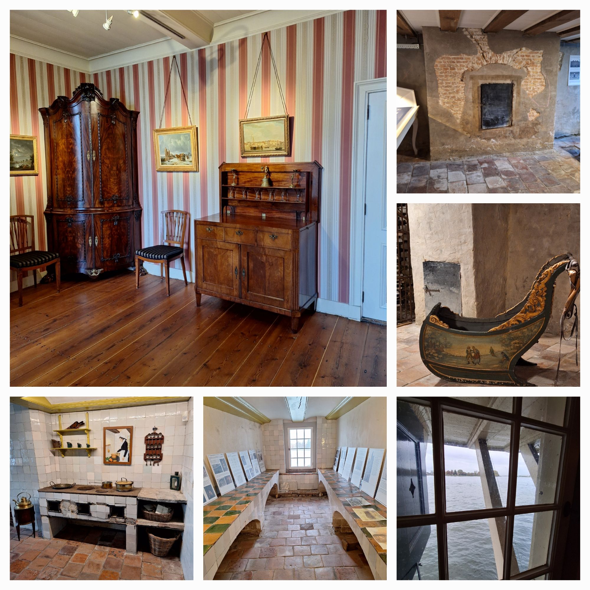 Mooiste en bijzonderste ruimte is wel de Maaskamer, een halfronde 18e eeuwse toevoeging, van waaruit je schitterend zicht hebt op het rivierenknooppunt. Er staan geen stoelen, maar zou je daar zitten, dan zit je eersterangs. Wat een fantastisch uitzicht!