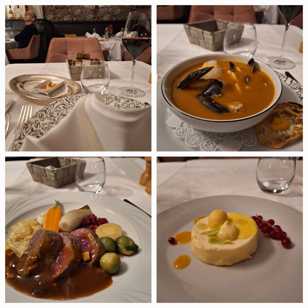 In de eetzaal, ook al zo mooi ingericht, geniet ik van een heerlijk diner (vissoep, hertfilet en puddinkje). Glanzend wit tafellaken, zilveren bestek.