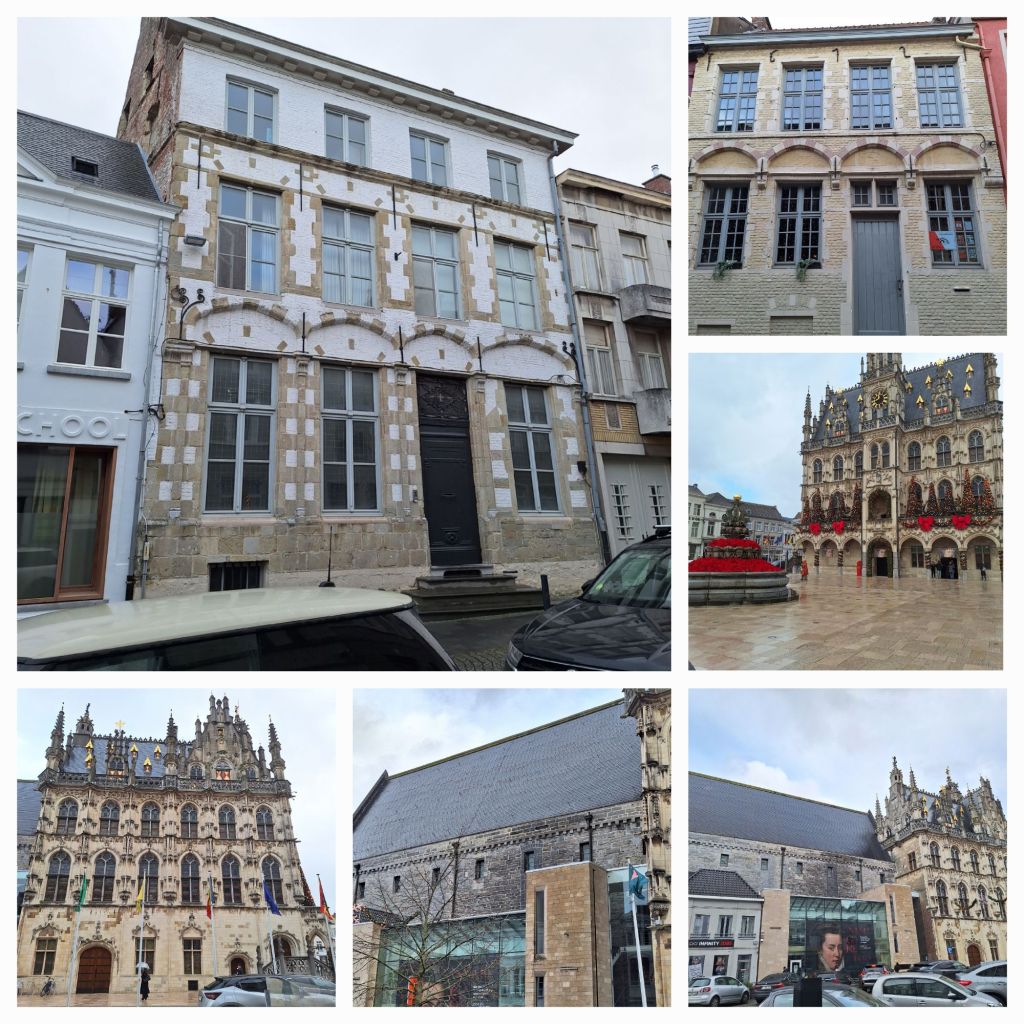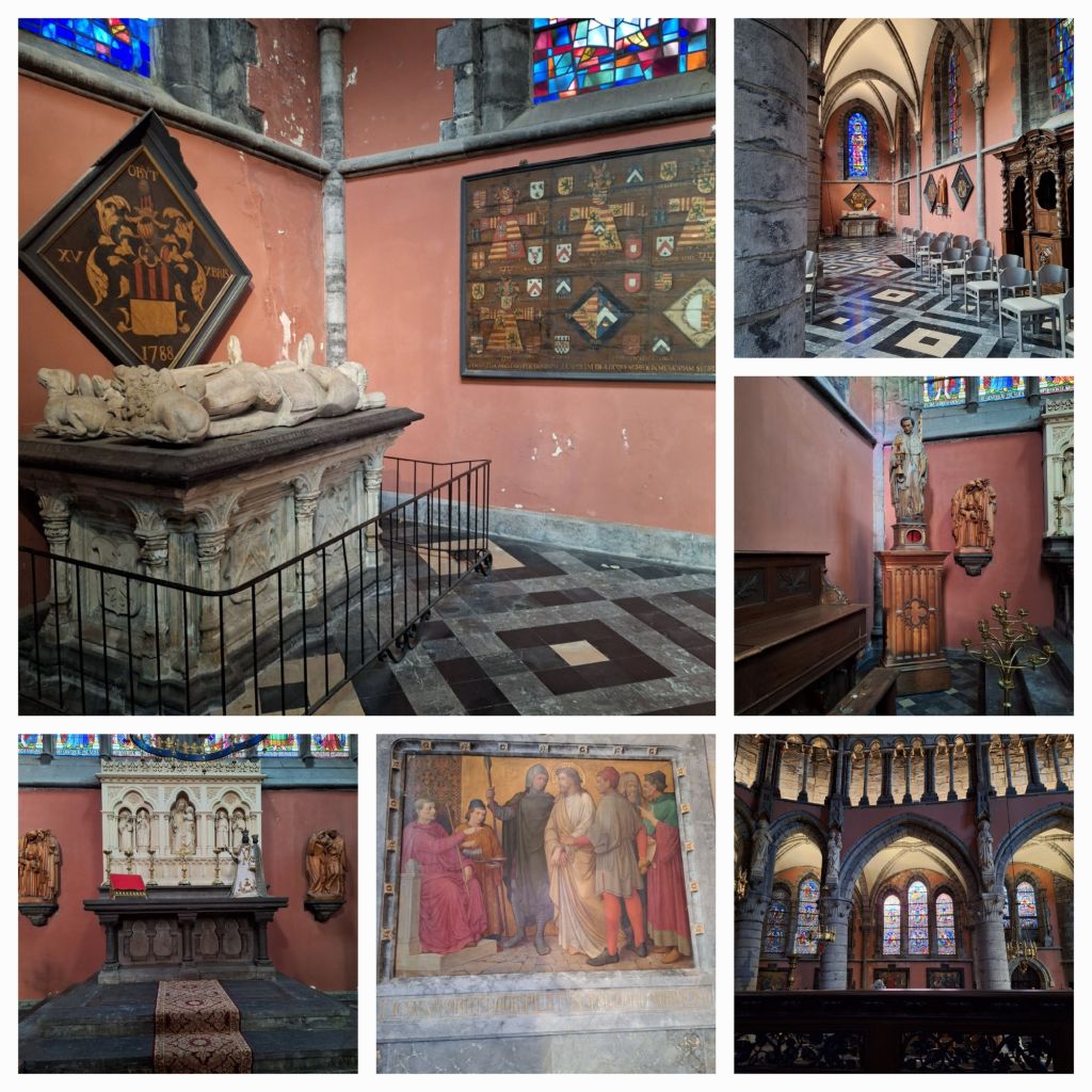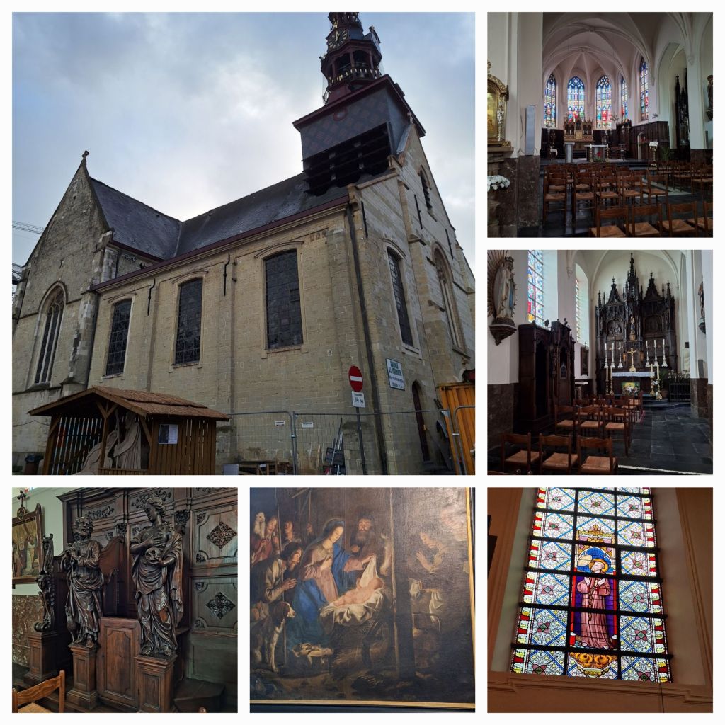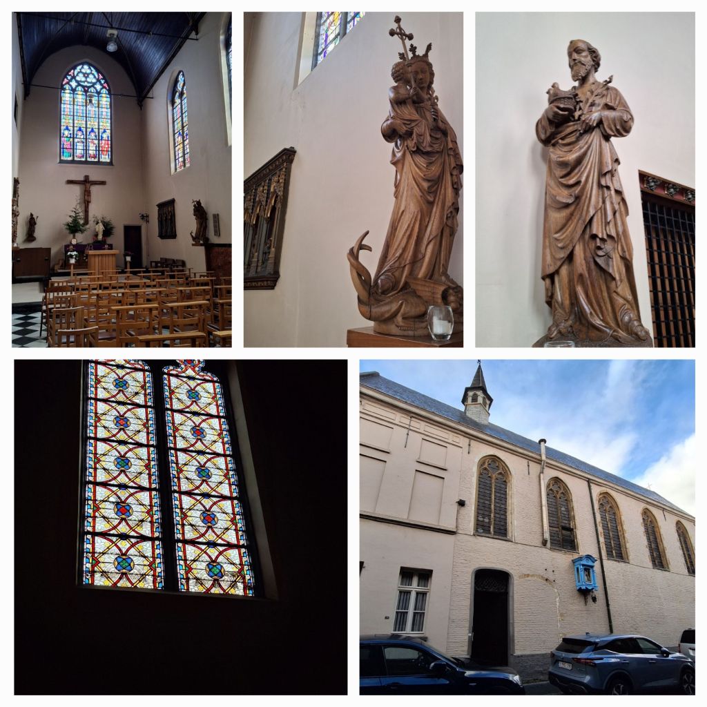 Ik loop terug naar de Markt en rechts staat een witte kerk met een blauw hokje met een Mariabeeld er in. De deur staat op een kier en ja, ik kan even naar binnen glippen. Het zijn een 16e eeuwse kapel en gasthuis , gebouwd voor de broederschap van Sint Jacob van Compostela. In 1846 werd het gebouw ingericht als slotklooster voor de karmelietessenorde.