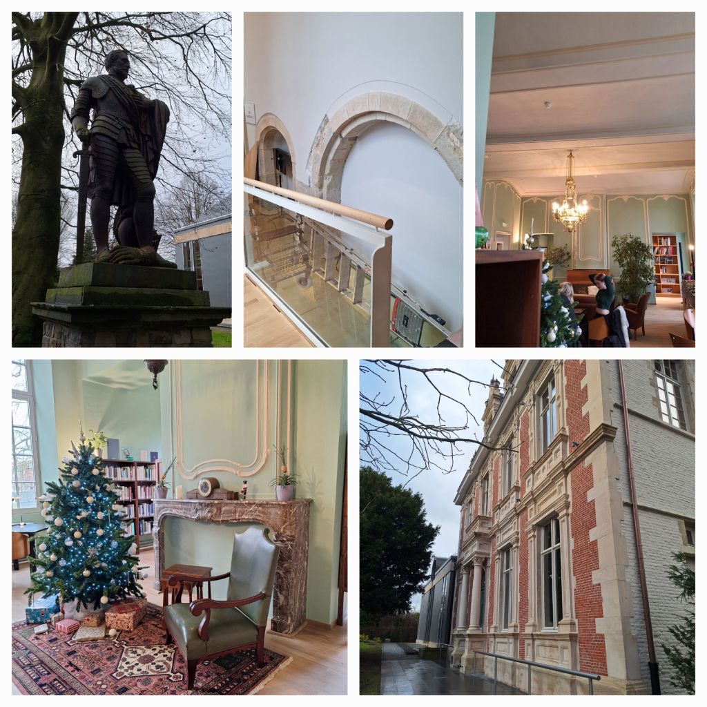 Het kasteel is nu een bibliotheek. Ik loop er even om heen en dan ga ik naar binnen. Veel kan ik niet zien, maar toch nog wat deuromlijstingen in natuursteen.