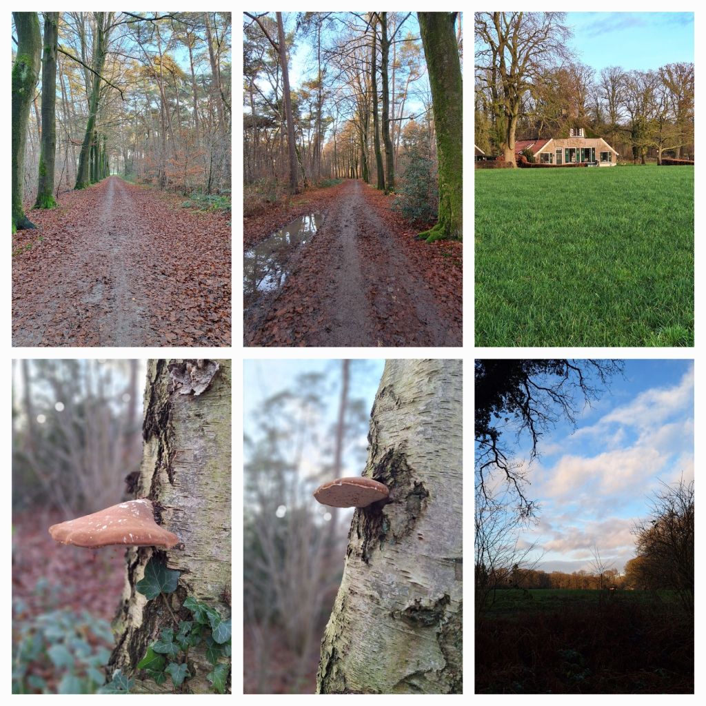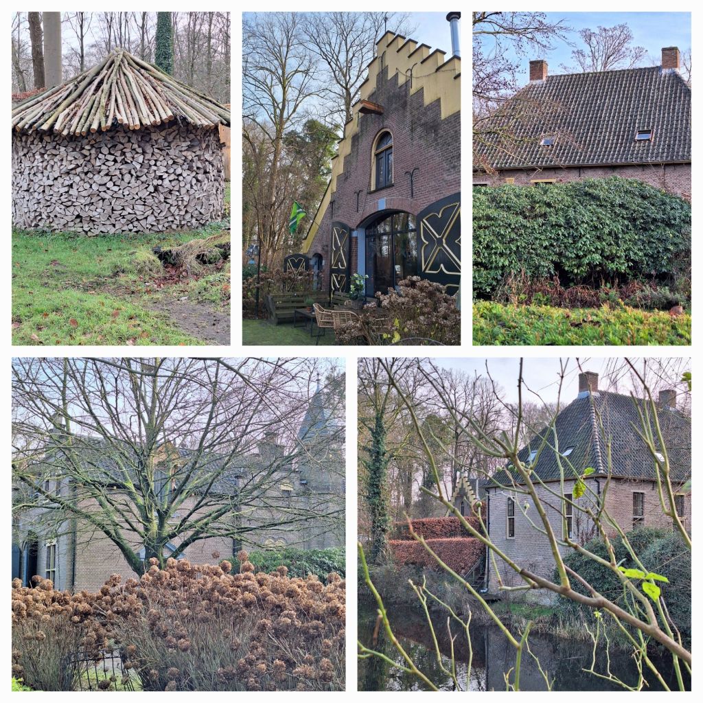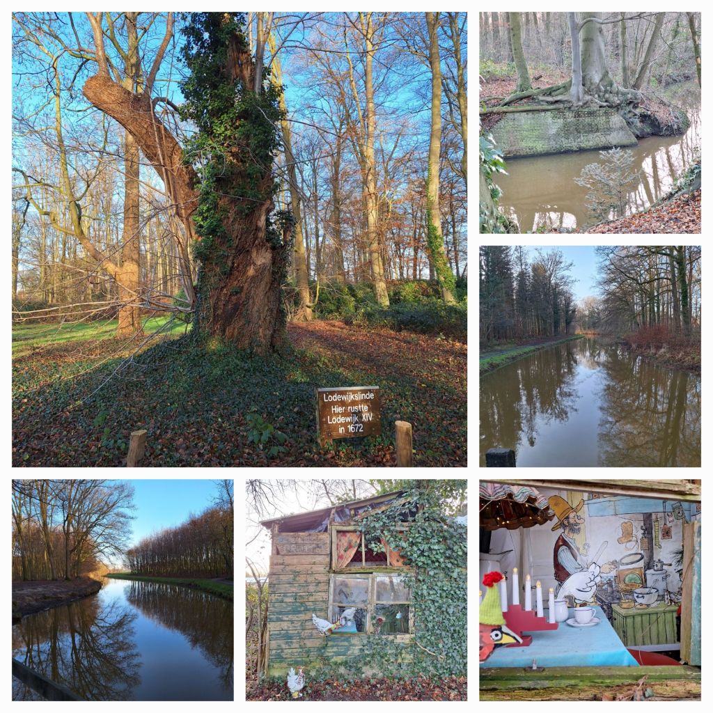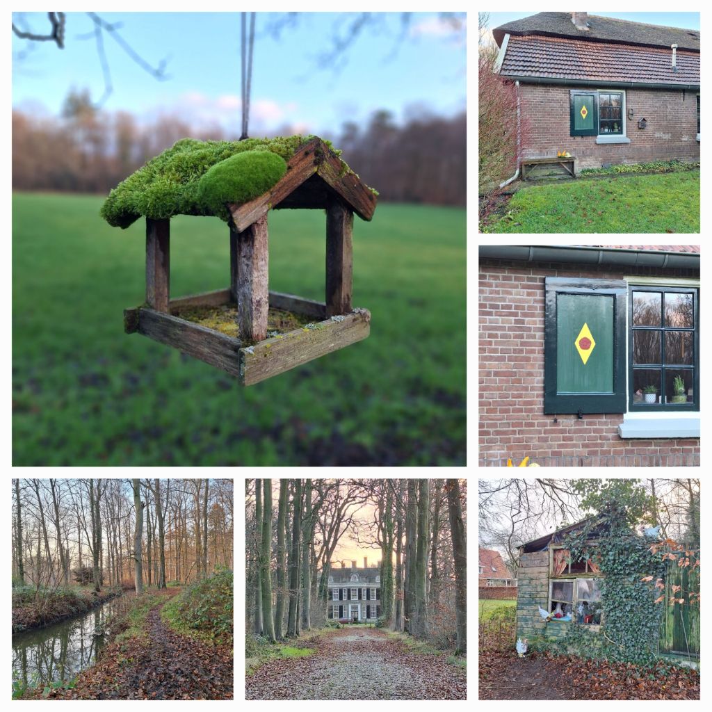 Tijd om de audiotour in te leveren en dan ga ik op pad door de bossen van Landgoed Vorden en Landgoed De Kieftskamp. Sommige paden zijn enorm modderig, maar de rust en de natuur maken alles goed. Ik geniet van de omgeving, de mooie lanen, de vergezichten als ik even uit het bos ben, Ergens bij een huis staat een oud kippenhok. Het is ingericht als een soort huisje. Tafeltje, stoeltje, kerstboompje, achterwand voorzien van een mooie afbeelding, erbuiten wat houten kipjes. Lachend loop ik verder.