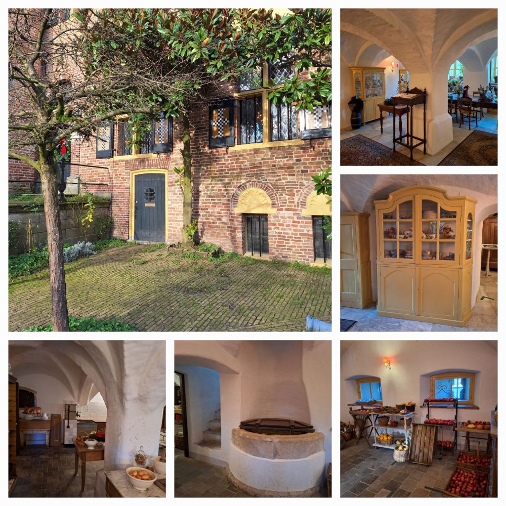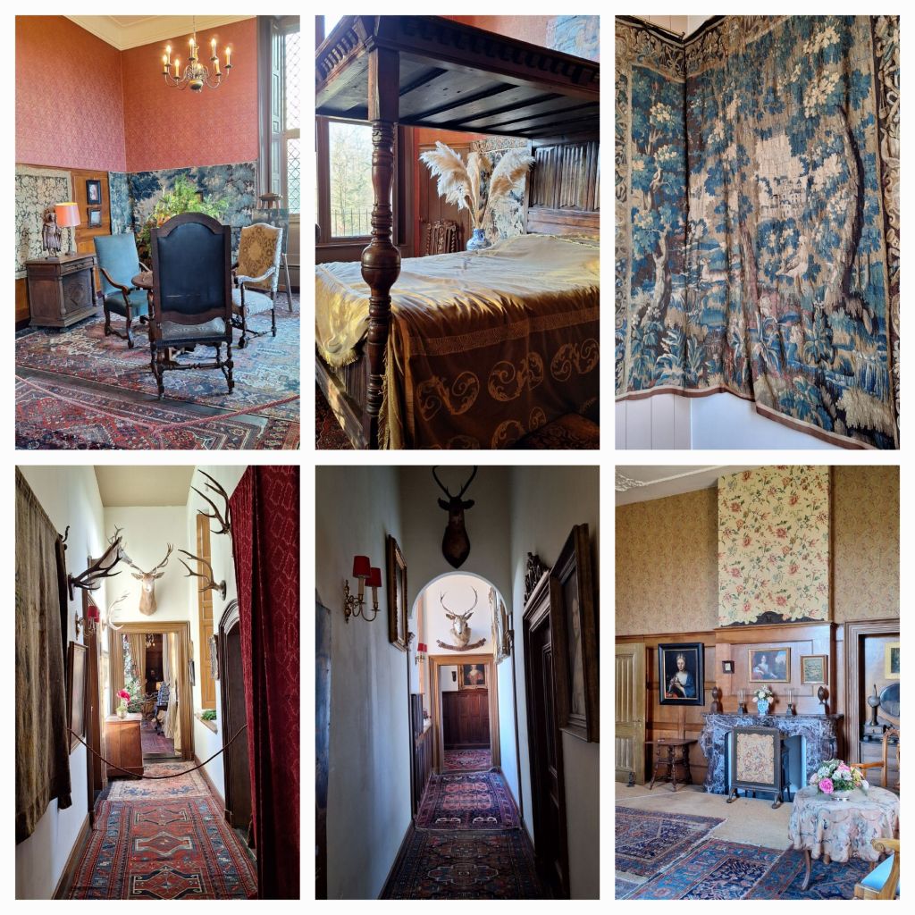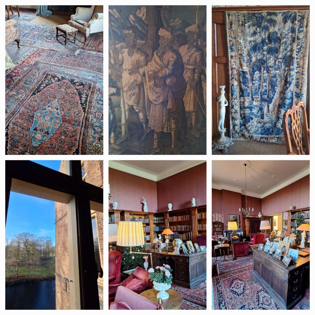 De wandtapijten dienden drie doelen. Ze hielden kou en tocht tegen, ze hielden vocht tegen én ze waren een ‘conversation piece’. In de meeste ruimtes liggen meerdere tapijten van diverse groottes op de grond, deels over elkaar heen. Ik snap dat wel. De vloeren zijn van hout, en ondanks de vloerbedekking zo her en der, zullen tocht en kou de weg naar je voeten en benen kunnen vinden.