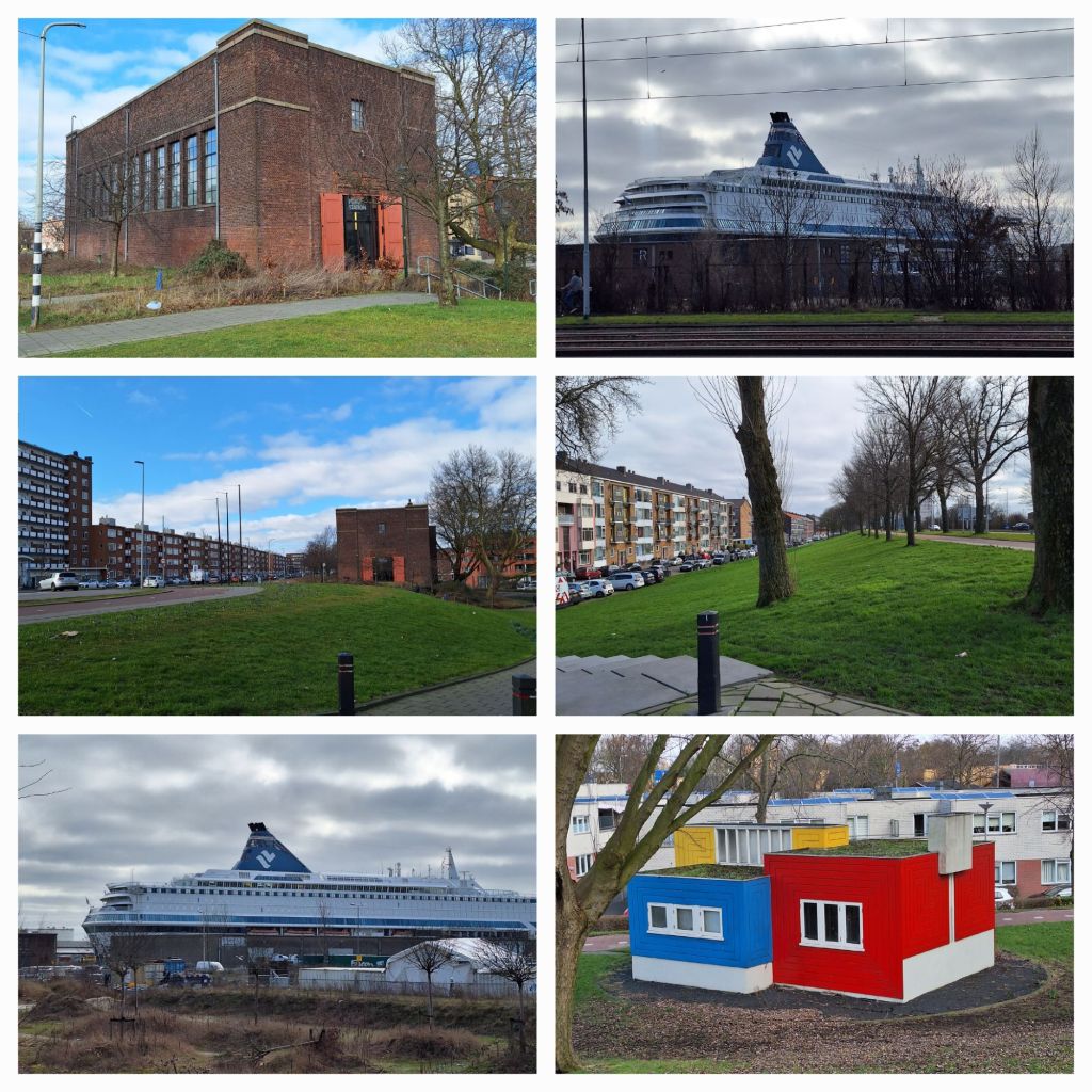 Over de Broersvest loop ik naar de Rotterdamsedijk en dan ben ik op de Schielandse Hoge Zeedijk. Bij het Pompgebouw uit 1922 is heel duidelijk te zien dat ik op een hoge dijk loop. De straat ligt diep onder aan de dijk. Aan de overkant van de weg zijn de havens te zien en een groot zeeschip.