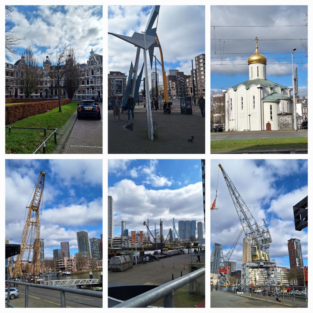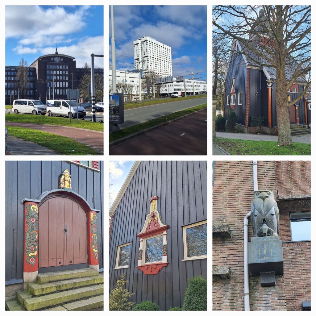 Het voormalige Dijkzigt, nu Erasmus Medisch Centrum, schittert wit tegen de intens blauwe lucht. Pal er tegenover een houten gebouw met sfeervol kleurrijk houtsnijwerk: de Noorse Zeemanskerk. Gebouwd in 1914 in de 17e eeuwse Noorse bouwstijl. Wat een contrast.