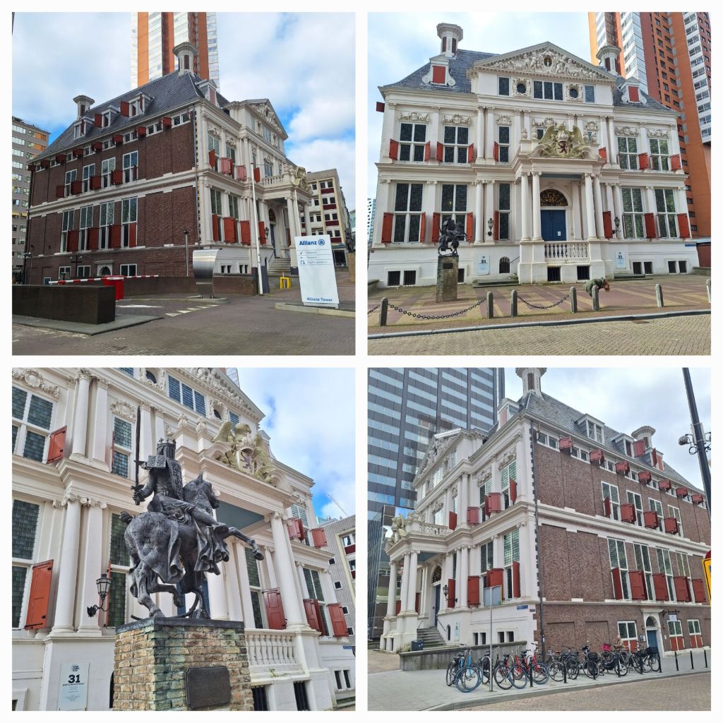 Linksaf naar de Schiedamsedijk, waar rechts de museumhaven ligt. Oude kranen en schepen steken af tegen de nieuwbouw. Als ik de Blaak oversteek loop ik de Korte Hoogstraat in en als een grote verrassing staat het Schielandshuis: 17e eeuws Hollands classicisme temidden van moderne nieuwbouw.
