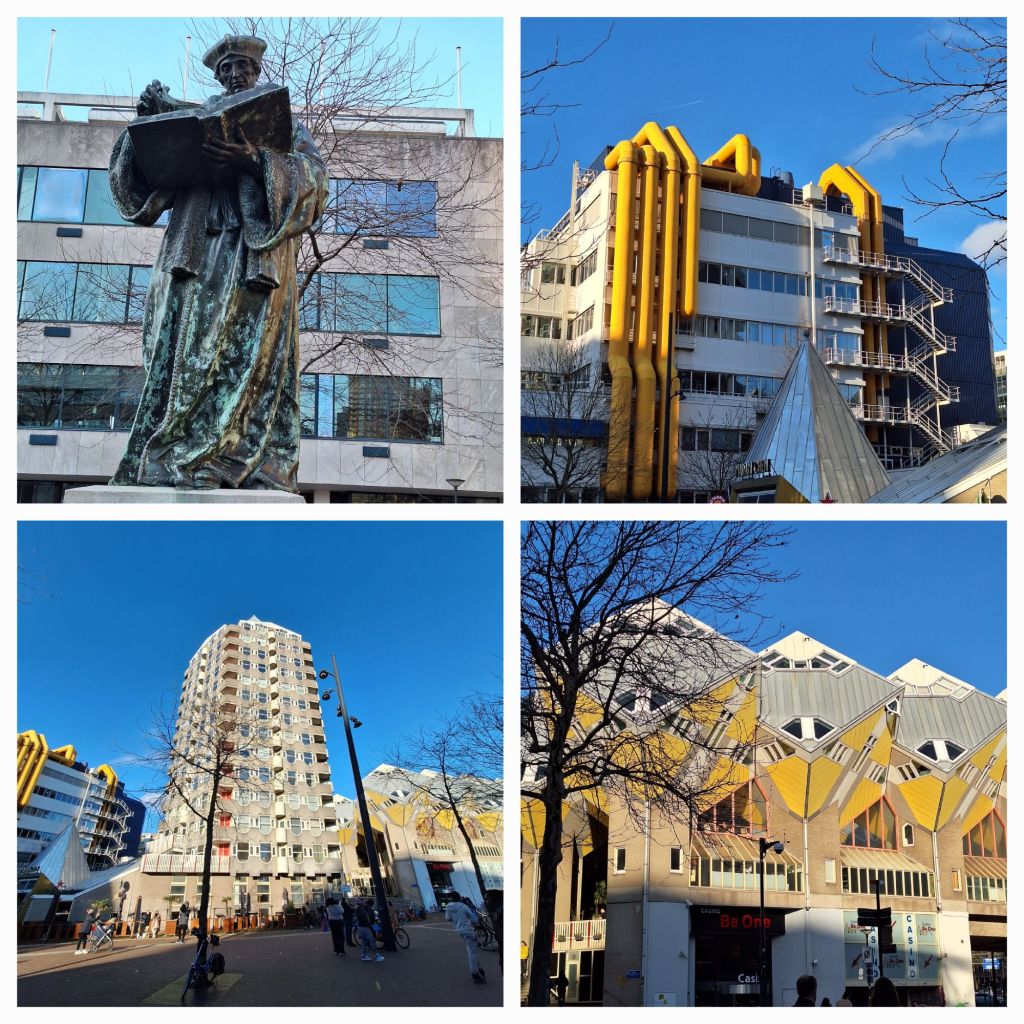 Ik begon bij een beeld (Aleid) en eindigde ook bij een beeld (Erasmus). Onderweg is nog veel meer kunst te zien, maar het meest frappante vond ik het beeld bij het Schielandshuis. Nee, niet dat van Pim Fortuin, nee, dat van Willem IV van Holland, ook wel bekend als Avesnes of Henegeouwen. Het moderne beeld laat een vechtersbaas zien, geharnast, zwaard geheven, vizier gesloten, op zijn steigerend paard. Hij liet het leven in Warns in de slag bij Stavoren en hij was de achterkleinzoon van Aleid.