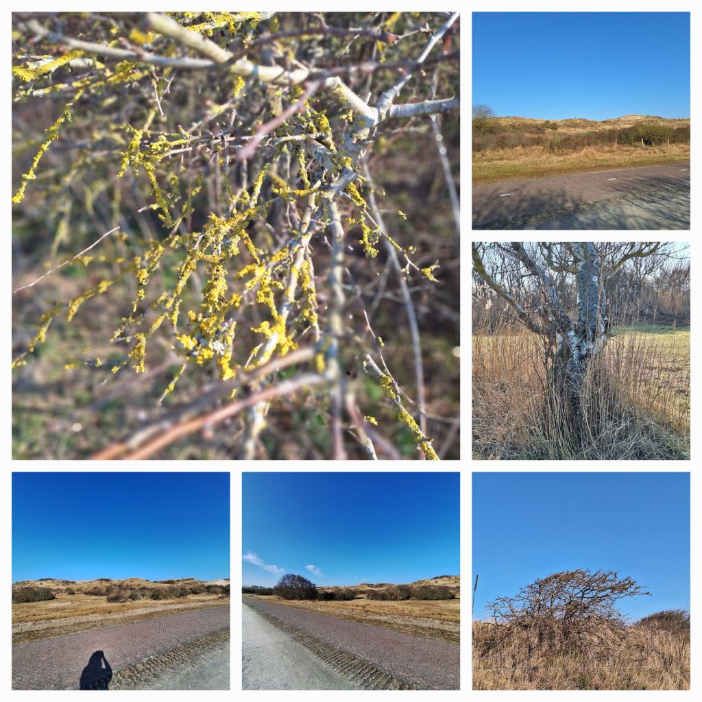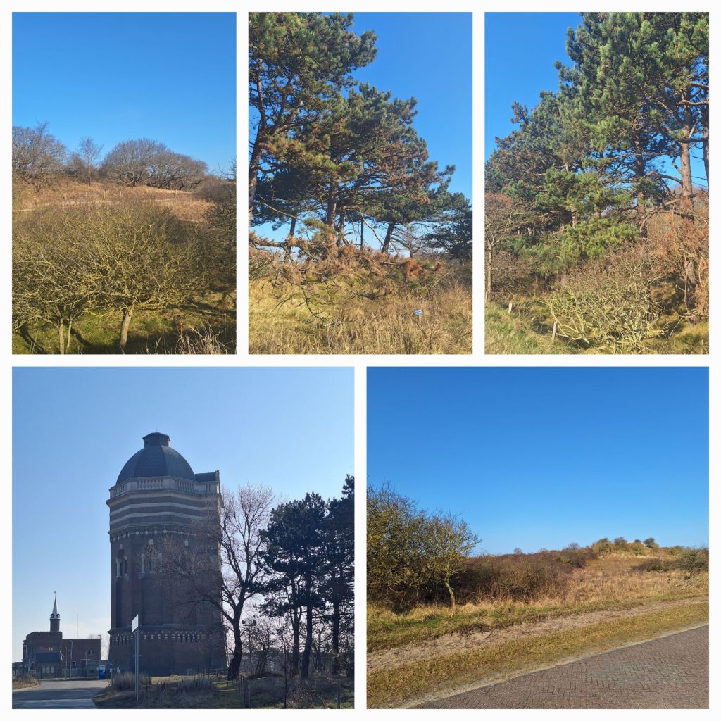 Op de duinen groeit van alles. Ik zie scheefgewaaide dennen, platte duindoornstruiken, veel grassen. Bij Ganzenhoek loop ik door een bos dat is aangelegd in de jaren 1930 als werkverschaffingsproject. Heerlijk, om even schaduw te hebben.