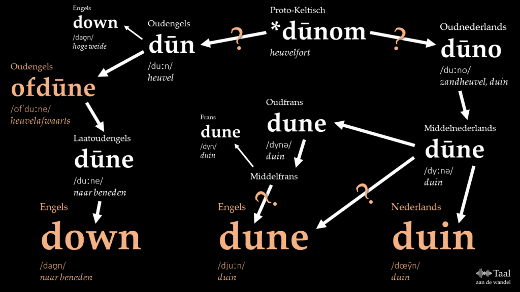 In het Engels werd het ook dune, maar er zijn nog twee woorden die vanuit dūnom zjin onstaan. Het woord down voor hoge weide, meestal in de meervoudsvorm downs. En via het Oudengels ofdūne voor heuvelafwaarts komen we aan down voor naar beneden. Tja, taalontwikkeling is iets merkwaardigs.