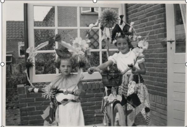 Op de foto uit 1953 zie ik twee prachtig uitgedoste meisjes. Hun fietsen zijn voorzien van feestbogen en mevrouw Temminck mag de rok van haar moeder dragen. Haar brede glimlach spreekt boekdelen. Natuurlijk is de rok veel te groot voor haar vijf jaren (vandaar het elastiek) maar dat deert niet: het is feest!