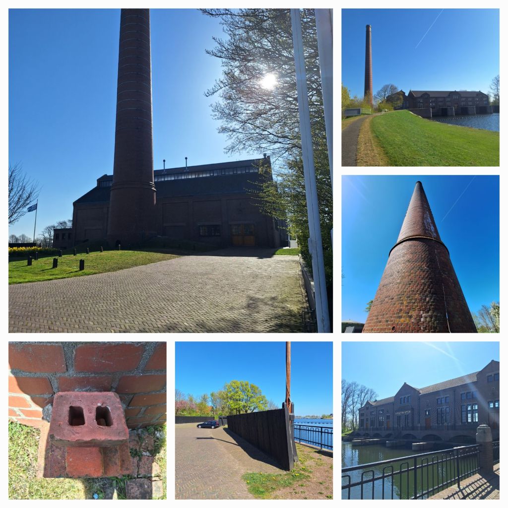 Bij de schoorsteen staan we met het hoofd in de nek. 60 meter hoog, 3.5 m doorsnee boven, 6,5 m beneden, gemaakt van speciale radiale bakstenen met gaten, zodat de rookgassen veilig konden worden afgevoerd.