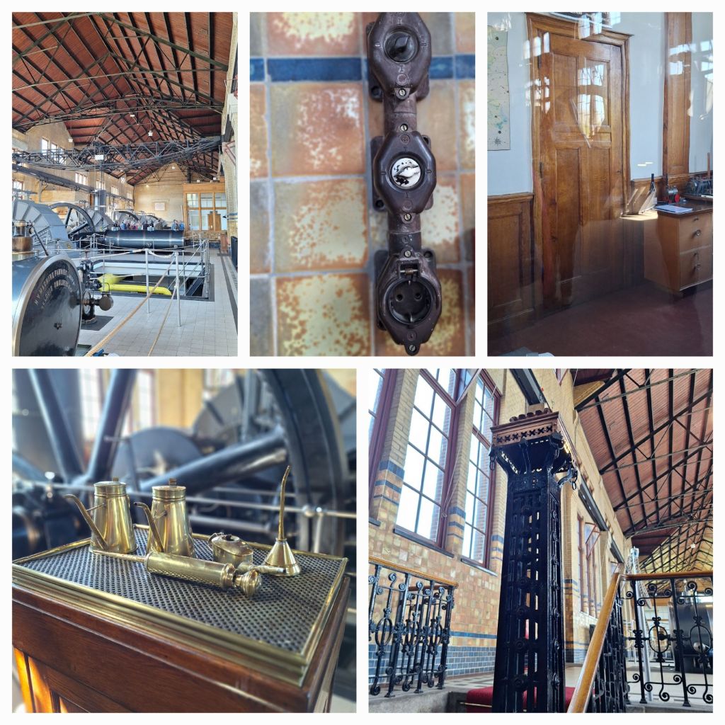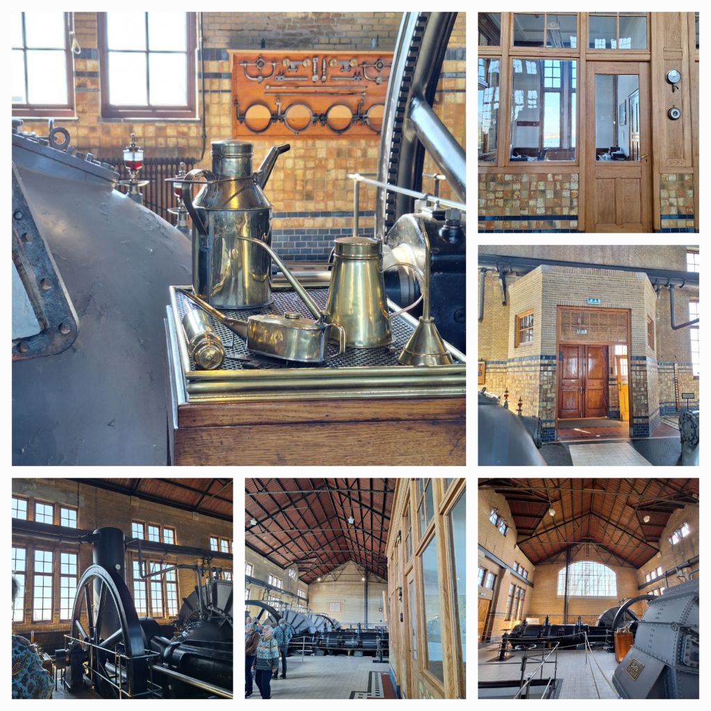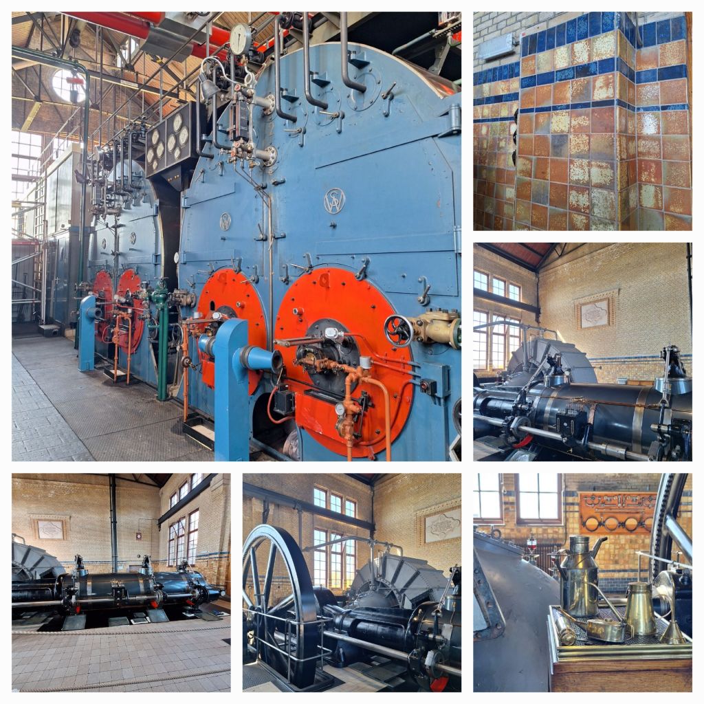 De grote hal met stoommachines is indrukwekkend, qua grootte maar ook qua architectuur. De lichtgele stenen, de tegeltjes in blauw en zachtrood/oker, het gladde gelakte hout, de glanzende koperen oliekannen. En natuurlijk de vier zwarte stoommachines en de acht grote grijze centrifugaalpompen.