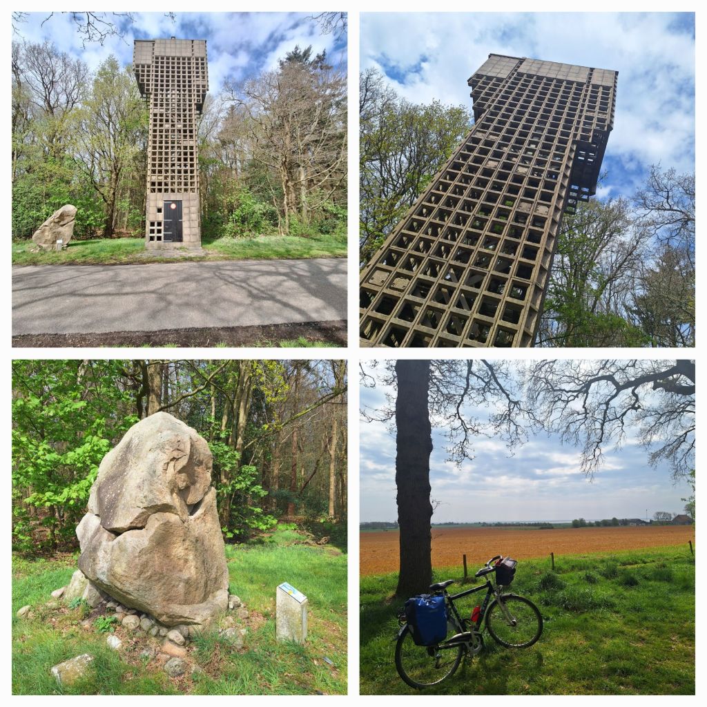 Over een prachtig betonnen fietspad ga ik door de bossen naar Oudemirdum. Ik weet dat daar vlakbij een luchtwachttoren staat. Een relict uit de Koude Oorlog. Ik moet even klimmen en dan kijk ik uit over het IJsselmeer. Rechts van de weg staat een enorme zwerfkei, zoals overal in Gaasterland te vinden (er is zelfs een stenenroute), en daarnaast een betonnen raatbouwtoren.