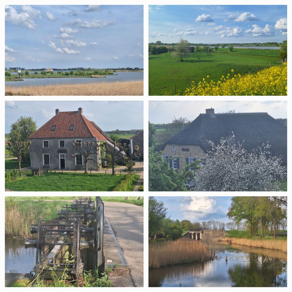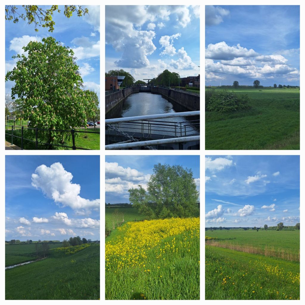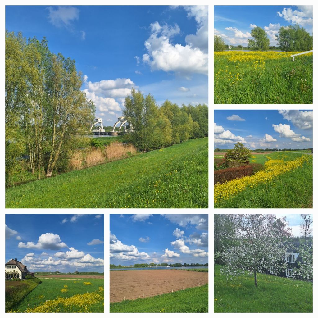Het is schitterend weer geworden, met veel zon, wolken, zo nu en dan dreigt er regen, maar het blijft droog. Koolzaad, raapzaad en fluitekruid geven de bermen kleur. Her en der staan bloeiende fruitbomen.