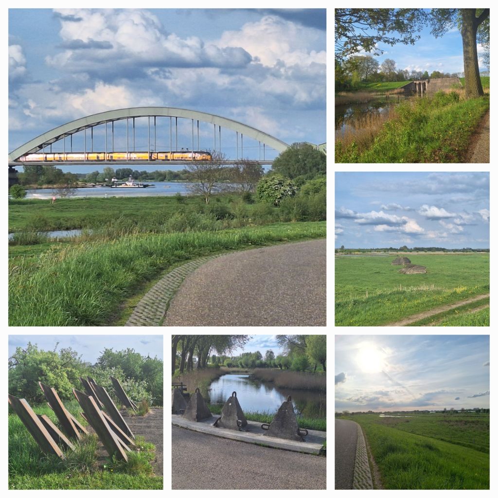 Dit landschap, rivieren, dijken en polders, ik blijf het altijd weer mooi vinden. De vergezichten over de rivier, de langsvarende schepen, in de verte kruipen de knalgele intercity’s als overmaatse rupsen over de spoorbrug.