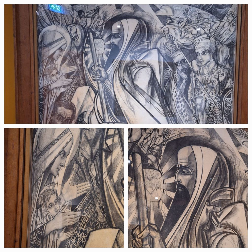 De Pelgrim van Jan Toorop: in een grote tekening zijn de figuren bijna niet uit elkaar te houden, maar middenin staat een bijna dreigend aandoende pelgrim die wordt ontvangen door Maria met het kindje. De tekening is zo vol met lijnen, dat het me duizelt. En toch fascineert het me.