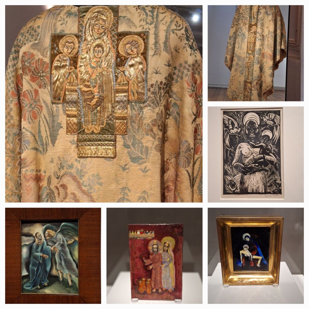 Een geborduurde zondeval, een prachtige kazuifel, een zwarte madonna, een vrouwelijke engel in de annunciatie, maar ook werk van kunstenaars die theosofie als uitgangspunt nemen. Volgens deze religieuze filosofie komen alle religies voort uit een tijdloze wijsheid.