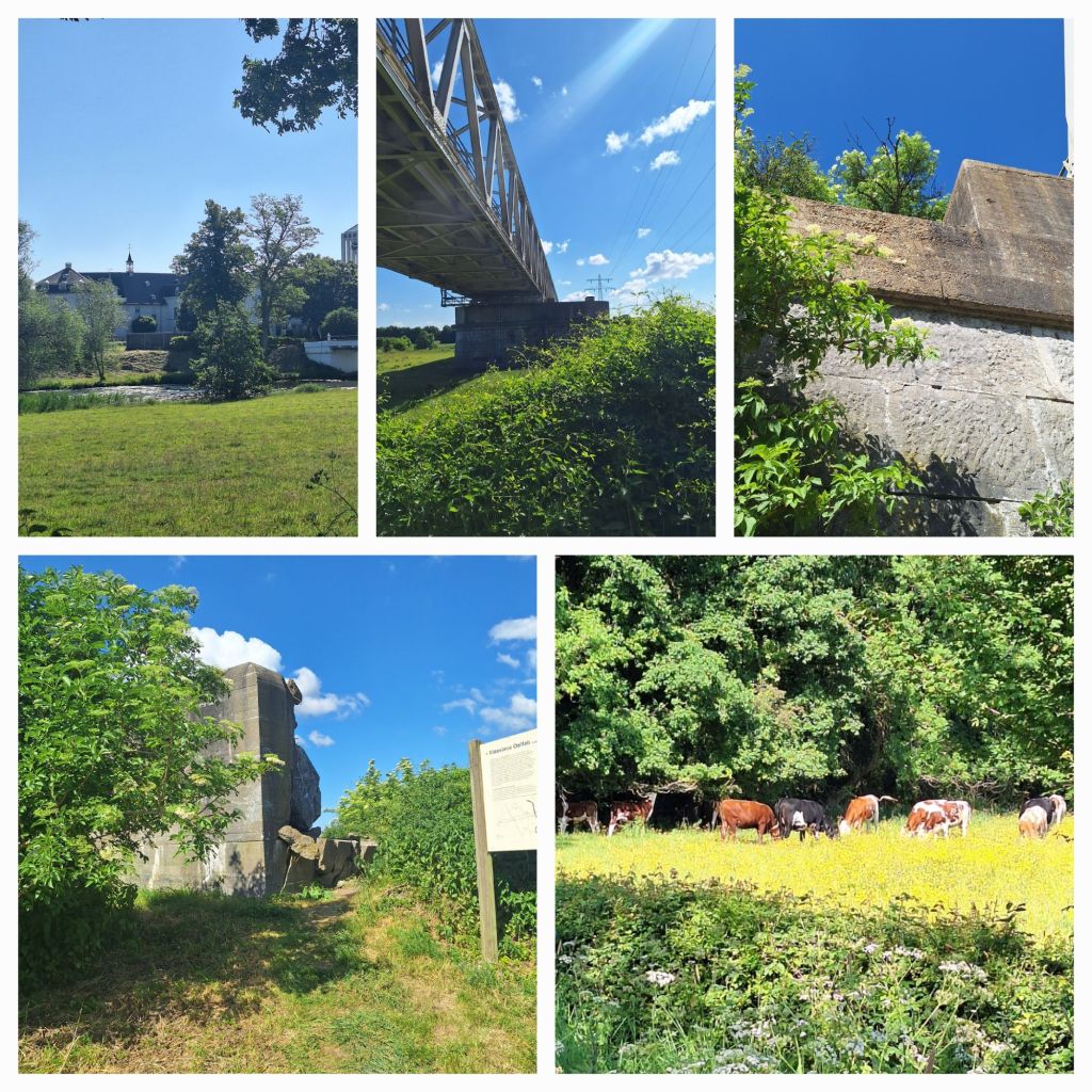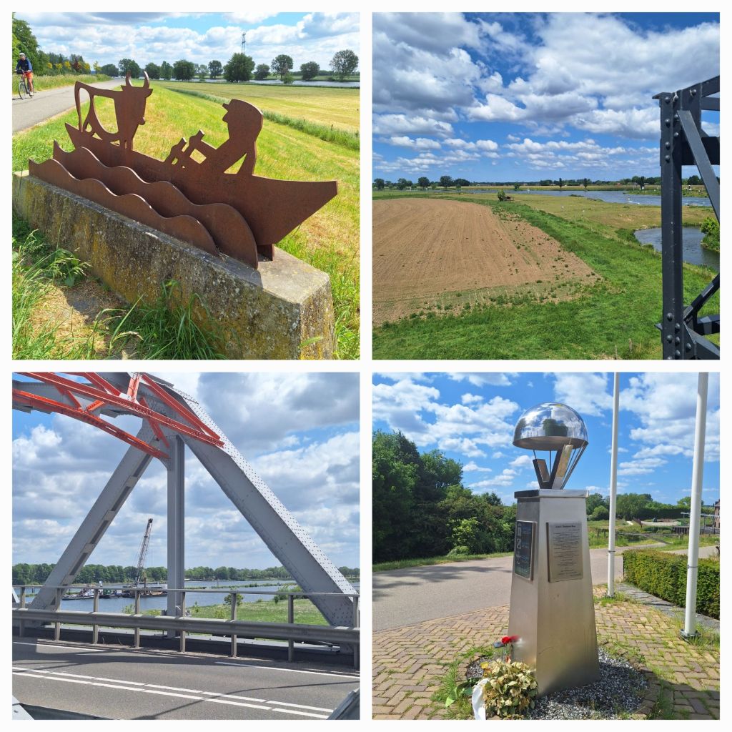 Ik zie het veertje op Niftrik varen, maar het is tijd om naar de trein te gaan. Ik rij langs het vroegere veerhuis en iets verderop langs twee rondelen die zijn teruggevonden bij de dijkverzwaring. Net voor het spoor sla ik linksaf en door het park ga ik richting het station.