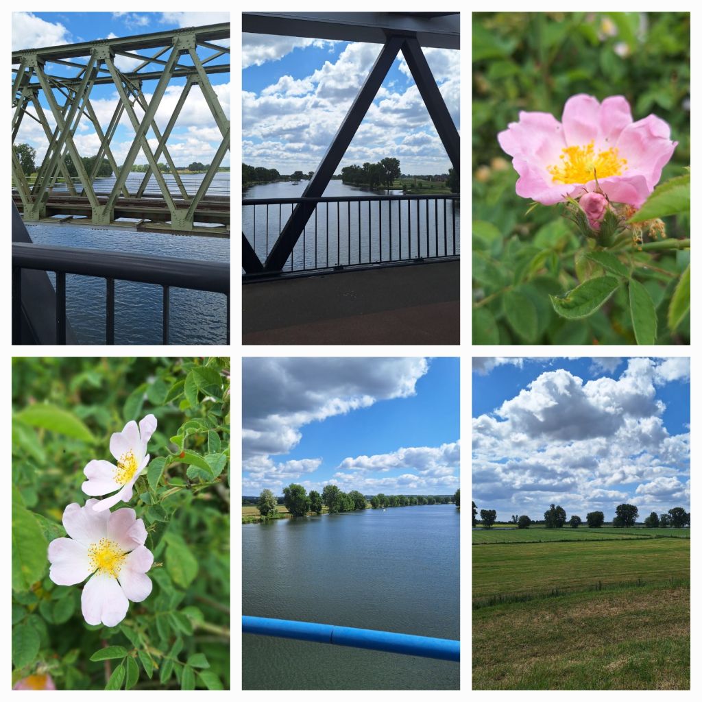 In de verte zie ik de verkeersbrug over de Maas naar Gennep. Deze vakwerkbrug stamt uit 1955 en is een opvolger van de spoorbrug uit 1873. De spoorlijn Boxtel-Wesel, het Duits Lijntje genoemd, stak hier de Maas over. Beetje een hoofdpijndossier, want bij een mogelijke oorlog zou Pruisen zo de Maas kunnen oversteken. Reden om in de derde pijler een mijnkamer aan te leggen waarmee de brug in geval van oorlog kon worden opgeblazen.