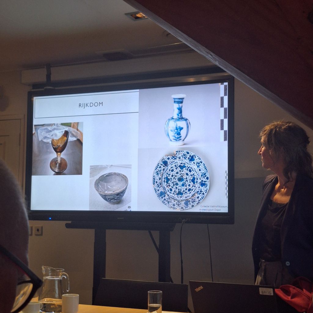 Wat is er allemaal zoal gevonden in die beerput? Het zit nu allemaal in dozen. 90 dozen in totaal: 79 dozen met non-organisch materiaal waarvan 31 dozen met ‘goodies’: 414 stuks keramiek, I44 stukjes kleipijp, 411 stulks glas, 136 objecten van metaal, knopen en kralen, ca. 400 stukken lakzegel en 11 dozen met organisch materiaal, (hout, zaden, bot, textiel).
