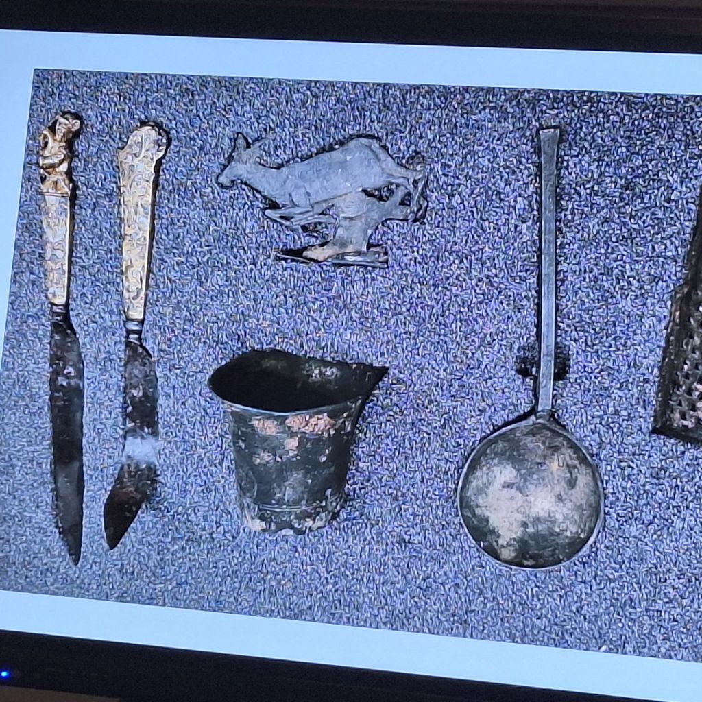 Ze laat foto’s zien van allerlei vondsten. En mes en vork, een nootmuskaatrasp, twee muizenvallen, een prachtig gouden hangertje. Er zijn ook delen gevonden van een babyschedeltje, van een doodgeboren kindje na zeven maanden zwangerschap. Uiteraard hebben de familieleden hiervoor de nodige belangstelling.