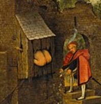 Natuurlijk komt dit plaatje voorbij, van een schilderij van de grote Bruegel, maar dit geeft toch wel een klein beetje aan hoe het in vroeger tijden ging. Als je in een oud kasteel rondloopt, kom je het wel tegen: het gemak of het secreet. De poep- of kakdoos in of aan de buitenmuur gemetseld en je behoefte viel gelijk in de gracht.