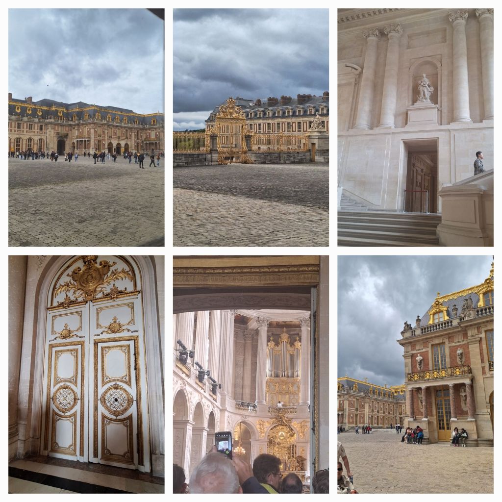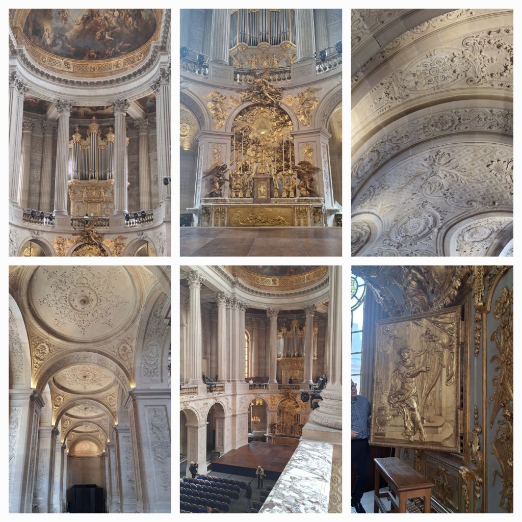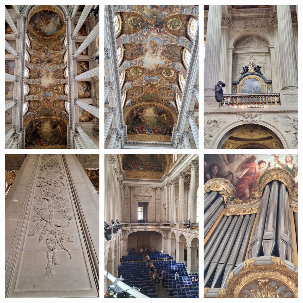 Het duurt even voor we binnen zijn en andere bezoekers moeten worden tegen gehouden (privéconcert!) maar dan staan we in de Koninklijke Kapel! Het is de vijfde kapel die het paleis heeft gekend, gebouwd onder Lodewijk XIV, en gewijd aan Lodewijk de Heilige. De buitenzijde is al mooi, met de met goud beklede nok die de strenge symmetrie van het paleis doorbreekt, maar binnen sta je even met open mond en het hoofd in de nek de plafondschildering te bewonderen. En hoog boven de goudglinsterende achterwand staat het orgel in wit, groen en goud. En daar komen we voor.