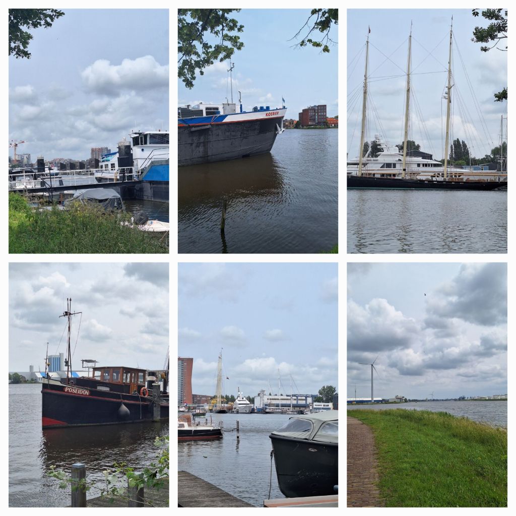 Langs het water wandelen is altijd mooi, zelfs in een zo verstedelijkt gebied als rondom Amsterdam. Als ik eenmaal de grote weg gepasseerd ben, kom ik langs een bushalte met de merkwaardige naam Delftse Rij. Er liggen overal schepen en boten afgemeerd, aan de overzijde van het kanaal zie ik een grote cruiser met ervoor een prachtige driemaster. Plezier- en beroepsvaart wisselen elkaar hier af. Links zie ik de eerste grote gebouwen achter hekken, dan een lange rij rijtjeshuizen (de Delftse Rij zal ik later te weten komen) en dan ben ik er.