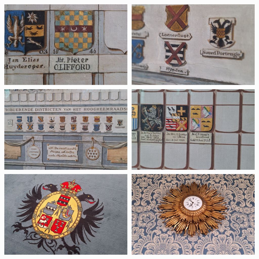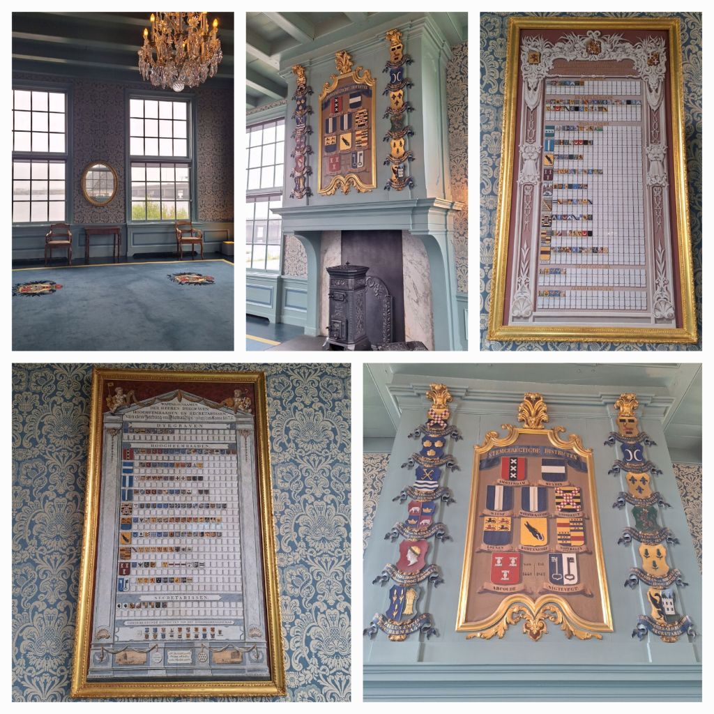Boven de schouw hangen de wapenborden van de stemgerechtigde waterschappen, van de hoogheemraden en van de dijkgraaf en secretaris. De hoogheemraden werden gekozen, net zoals nu nog steeds waterschapsverziezingen worden gehouden, maar de dijkgraaf wordt aangesteld door de Kroon zoals dat zo mooi heet.