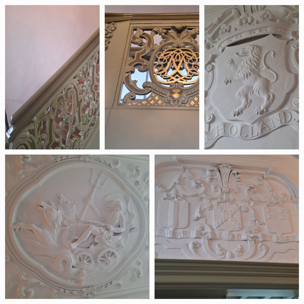 De hal is in overdadige Lodewijk XIV-stijl gedecoreerd met prachtig gestucte provincie- en stadswapens en midden op het plafond Poseidon die op zijn wagen over de golven rijdt, temidden van de zon, de maan en de vier windstreken. De trap is een juweel van houtsnijkunst en vanuit de hal zie ik de symetrisch aangelegde tuin met in de verte het Nieuwe Diep.